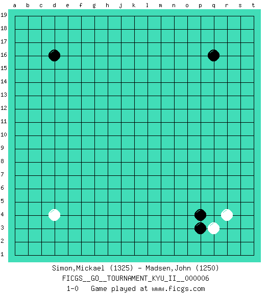 Last move : 1-0 2009 February 16 21:13:47 [Event "FICGS__GO__TOURNAMENT_KYU_II__000006"] [Site "FICGS"] [Date "2009.01.07"] [Round "1"] [Black "Simon,Mickael"] [White "Madsen,John"] [Result "1-0"] [Rating 1 "1325"] [Rating 2 "1250"] 1.q16 r4 2.d16 d4 3.p3 q3 4.p4 1-0 This go game has been lost on time (started : 2009.01.07 2:30:7) Here are the names of the openings (joseki) played in the four corners : Corner q4 : r4 p3 Komoku (Somok, Xiao~mu`) 3-4 Point. The komoku (3-4) point is the traditional corner enclosure move.. Ikken Kakari (Hankan Keolch'im, Yi Gua`jiao~, 1-Space Low Pincer). The small knight move is the basic approach move to the 3-4 point stone. It has been continually used for over four centuries. There are limitless variations, with new moves constantly being discovered. Black 2 opens the door to a treaure store of joseki. Player Black won this Go (weiqi, baduk) game. Follow this game move after move (download)There is damezumari at the bamboo joint. (Anonymous) 98% of all statistics are made up. (Author unknown)