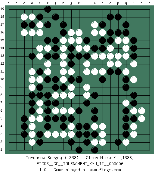 Last move : 1-0 2009 March 20 21:44:23 [Event "FICGS__GO__TOURNAMENT_KYU_II__000006"] [Site "FICGS"] [Date "2009.01.07"] [Round "1"] [Black "Tarassov,Sergey"] [White "Simon,Mickael"] [Result "1-0"] [Rating 1 "1233"] [Rating 2 "1325"] 1.q16 d4 2.q4 d16 3.q10 d10 4.k4 k16 5.k10 o17 6.o16 n16 7.o15 p17 8.q17 r6 9.q6 q7 10.r7 s5 11.r5 s6 12.r8 r3 13.q3 q2 14.p2 r4 15.q5 r12 16.r13 q13 17.r14 q11 18.p11 r10 19.q9 p12 20.o11 o12 21.n12 n13 22.o13 o14 23.n14 p13 24.p14 o13 25.m14 m13 26.d6 f3 27.c17 c16 28.d17 e17 29.e18 f18 30.f17 e16 31.g18 d18 32.f19 c18 33.n15 p15 34.p16 q14 35.n17 m16 36.o18 m17 37.p18 q15 38.r15 l14 39.l13 l12 40.k13 k14 41.m12 l11 42.j13 n11 43.h16 j16 44.j14 h15 45.h17 j15 46.g15 h14 47.l15 k15 48.n10 m11 49.e9 d9 50.e8 e10 51.f10 h12 52.j12 j11 53.d13 f11 54.e11 f12 55.f13 f14 56.f15 e14 57.g13 h13 58.g14 e13 59.j10 h10 60.h9 d11 61.g10 h11 62.g5 j3 63.k3 j4 64.j5 k5 65.h4 h3 66.f4 g3 67.c3 d3 68.c4 d5 69.c5 e6 70.d7 l5 71.m3 h6 72.h5 j6 73.f6 e7 74.f7 e5 75.d8 g6 76.f5 g8 77.g7 h8 78.f8 j8 79.g9 j9 80.l7 l8 81.m8 l9 82.e2 d2 83.e3 l3 84.l4 m4 85.l2 k2 86.l3 n3 87.j2 m2 88.k1 l1 89.m1 n2 90.m5 n4 91.k6 l6 92.m6 1-0 Here are the names of the openings (joseki) played in the four corners : Corner q16 : q16 o17 Hoshi (Hwajeom, Seongjeom, Xingwei`) 4-4 Point. The star or hoshi (4-4) point, emphasizing influence at the potential expense of territory. Ikken Kakari (Hankan Keolch'im, Yi Gua`jiao~, 1-Space Low Approach). White 2 is the standard approach move to the 4-4. Corner q4 : q4 r6 Hoshi (Hwajeom, Seongjeom, Xingwei`) 4-4 Point. The star or hoshi (4-4) point, emphasizing influence at the potential expense of territory. Ikken Kakari (Hankan Keolch'im, Yi Gua`jiao~, 1-Space Low Approach). White 2 is the standard approach move to the 4-4. Corner d4 : d4 d6 Hoshi (Hwajeom, Seongjeom, Xingwei`) 4-4 Point. The star or hoshi (4-4) point, emphasizing influence at the potential expense of territory. Ikken Takagakari (Hankan Nop'dakeolch'im, Yi Gaojia, 1-Space High Approach). White typically responds at 6-4 or 3-10. White 4-10 is played when White finds play on the right side advantageous. White 4-8 or 3-8 may be played when White has support at top. Corner d16 : d16 c17 Hoshi (Hwajeom, Seongjeom, Xingwei`) 4-4 Point. The star or hoshi (4-4) point, emphasizing influence at the potential expense of territory. Player Black won this Go (weiqi, baduk) game. Follow this game move after move (download)Always remember, keep the balance. [between territory and influence] (Figaro) In my experience, there's no such thing as luck. (Obi-Wan Kenobi in Star Wars ep.4)