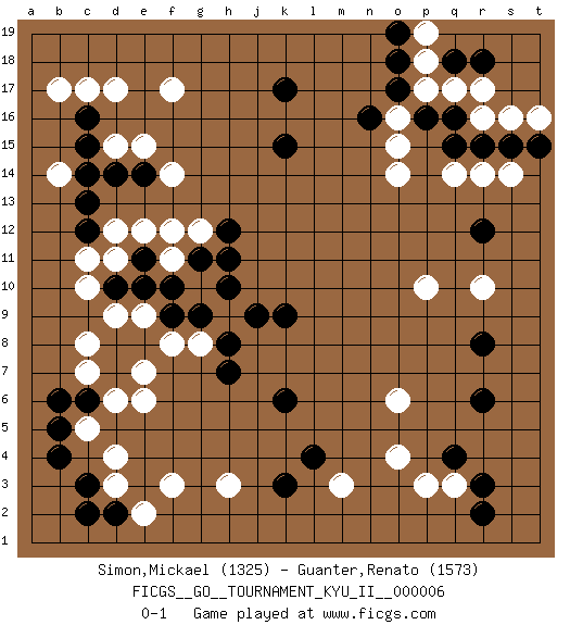 Last move : 0-1 2009 March 7 14:48:28 [Event "FICGS__GO__TOURNAMENT_KYU_II__000006 "] [Site "FICGS"] [Date "2009.01.07"] [Round "1"] [Black "Simon,Mickael "] [White "Guanter,Renato "] [Result "0-1"] [Rating 1 "1325"] [Rating 2 "1573"] 1.q16 d4 2.q4 d17 3.c15 d15 4.d14 e15 5.c16 c17 6.e14 f17 7.c6 f3 8.b4 o4 9.r6 q3 10.r3 p3 11.r2 d11 12.c12 c11 13.c3 c8 14.k17 r14 15.r15 q14 16.o17 r10 17.k3 m3 18.l4 h3 19.k6 o6 20.r8 p10 21.k9 c5 22.b5 d6 23.d7 c7 24.b6 d3 25.d2 e2 26.c2 e6 27.e8 g8 28.f9 g10 29.g9 h9 30.f10 e7 31.d8 f8 32.d10 d12 33.c13 f11 34.e10 d9 35.e11 e12 36.g11 g12 37.h11 f12 38.h10 c10 39.h8 f14 40.h7 b14 41.c14 b17 42.j9 e9 43.h12 r17 44.s15 p18 45.o18 p17 46.p16 r16 47.q15 s16 48.k15 o14 49.r12 s14 50.t15 o16 51.n16 o15 52.q18 q17 53.r18 p19 54.o19 t16 0-1 Here are the names of the openings (joseki) played in the four corners : Corner d16 : d17 c15Komoku (Somok, Xiao~mu`) 3-4 Point. The komoku (3-4) point is the traditional corner enclosure move..Ikken Kakari (Hankan Keolch'im, Yi Gua`jiao~, 1-Space Low Pincer). The small knight move is the basic approach move to the 3-4 point stone. It has been continually used for over four centuries. There are limitless variations, with new moves constantly being discovered. Black 2 opens the door to a treaure store of joseki. Corner d4 : d4 c6Hoshi (Hwajeom, Seongjeom, Xingwei`) 4-4 Point. The star or hoshi (4-4) point, emphasizing influence at the potential expense of territory.Ikken Kakari (Hankan Keolch'im, Yi Gua`jiao~, 1-Space Low Approach). Black 2 is the standard approach move to the 4-4. Corner q4 : q4 o4Hoshi (Hwajeom, Seongjeom, Xingwei`) 4-4 Point. The star or hoshi (4-4) point, emphasizing influence at the potential expense of territory.Ikken Takagakari (Hankan Nop'dakeolch'im, Yi Gaojia, 1-Space High Approach). Black typically responds at 6-4 or 3-10. Black 4-10 is played when Black finds play on the right side advantageous. Black 4-8 or 3-8 may be played when Black has support at top. Corner q16 : q16 r14Hoshi (Hwajeom, Seongjeom, Xingwei`) 4-4 Point. The star or hoshi (4-4) point, emphasizing influence at the potential expense of territory.Ikken Kakari (Hankan Keolch'im, Yi Gua`jiao~, 1-Space Low Approach). White 2 is the standard approach move to the 4-4. Player White won this Go (weiqi, baduk) game.Follow this game move after move (download ) Learn to play under the stones. (Anonymous) You have to believe in yourself. (Sun Tzu)