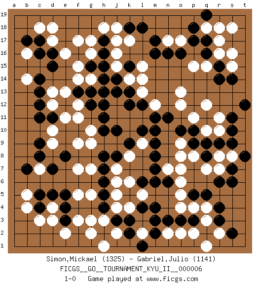 Last move : 1-0 2009 June 18 1:31:54 [Event "FICGS__GO__TOURNAMENT_KYU_II__000006"] [Site "FICGS"] [Date "2009.01.07"] [Round "1"] [Black "Simon,Mickael"] [White "Gabriel,Julio"] [Result "1-0"] [Rating 1 "1325"] [Rating 2 "1141"] 1.q16 d3 2.d16 q4 3.c5 c7 4.e4 d4 5.d5 f3 6.d7 k4 7.c8 k17 8.r6 r8 9.r3 q3 10.r4 o17 11.r14 r11 12.c14 f17 13.q5 o4 14.c11 r17 15.q17 q18 16.p18 s18 17.q19 r18 18.p17 s15 19.s14 s16 20.o16 n17 21.m4 o6 22.m6 k6 23.m8 n7 24.m7 o9 25.p5 o5 26.n16 k8 27.m10 l9 28.m9 k11 29.m17 m12 30.n11 o13 31.m3 n2 32.k3 j4 33.j3 h3 34.h2 g2 35.h4 g3 36.m2 j2 37.k2 h1 38.n3 o2 39.p3 p4 40.o3 p2 41.l4 l2 42.l1 j6 43.n6 o7 44.o10 o12 45.p9 o8 46.q11 p11 47.p10 r10 48.q8 q7 49.r9 p8 50.q9 r7 51.s9 q12 52.t12 r2 53.s2 q1 54.s10 q10 55.s7 s8 56.t8 d18 57.s6 f11 58.c17 f7 59.h17 f15 60.h15 j16 61.h16 k14 62.k15 j15 63.f16 g16 64.g15 e16 65.k18 j18 66.l18 j17 67.f13 f14 68.g13 g14 69.h14 h13 70.j14 l15 71.k13 l14 72.h12 e13 73.e12 f12 74.g12 d13 75.j10 j11 76.h11 g10 77.h10 k10 78.j8 g9 79.h8 g7 80.h6 g5 81.h5 f5 82.l12 l11 83.m11 l13 84.k12 j12 85.j13 j7 86.h7 h18 87.k5 g17 88.h13 j5 89.l6 l5 90.l10 b16 91.d15 d17 92.c16 c18 93.b17 b14 94.c13 d12 95.c12 e11 96.k9 b5 97.b7 b4 98.c4 c3 99.e5 d9 100.c9 d10 101.e8 f9 102.e3 e2 103.d11 q15 104.r15 p15 105.m16 r16 106.s11 1-0 Here are the names of the openings (joseki) played in the four corners : Corner d4 : d3 c5 Komoku (Somok, Xiao~mu`) 3-4 Point. The komoku (3-4) point is the traditional corner enclosure move.. Ikken Kakari (Hankan Keolch'im, Yi Gua`jiao~, 1-Space Low Pincer). The small knight move is the basic approach move to the 3-4 point stone. It has been continually used for over four centuries. There are limitless variations, with new moves constantly being discovered. Black 2 opens the door to a treaure store of joseki. Corner q4 : q4 r6 Hoshi (Hwajeom, Seongjeom, Xingwei`) 4-4 Point. The star or hoshi (4-4) point, emphasizing influence at the potential expense of territory. Ikken Kakari (Hankan Keolch'im, Yi Gua`jiao~, 1-Space Low Approach). Black 2 is the standard approach move to the 4-4. Corner q16 : q16 o17 Hoshi (Hwajeom, Seongjeom, Xingwei`) 4-4 Point. The star or hoshi (4-4) point, emphasizing influence at the potential expense of territory. Ikken Kakari (Hankan Keolch'im, Yi Gua`jiao~, 1-Space Low Approach). White 2 is the standard approach move to the 4-4. Player Black won this Go (weiqi, baduk) game. Follow this game move after move (download)In an unreasonable situation, an unreasonable move is reasonable. (Tamino) The modern world has divided itself into Conservatives and Progressives. The business of Progressives is to go on making mistakes. The business of the Conservatives is to prevent the mistakes from being corrected. (G.K. Chesterton)