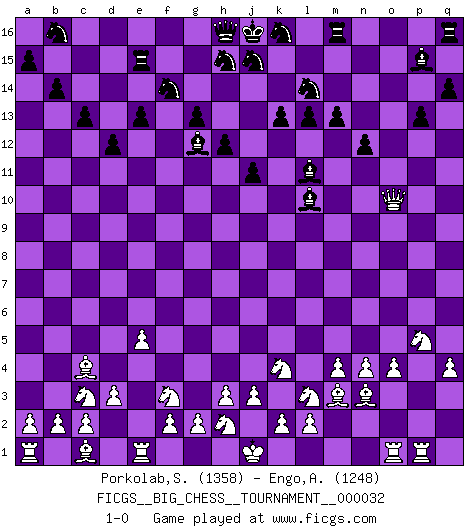 Last move : 1-0 2009 April 5 2:5:1 [Event "FICGS__BIG_CHESS__TOURNAMENT__000032"] [Site "FICGS"] [Date "2009.01.07"] [Round "1"] [White "Porkolab,Sandor"] [Black "Engo,Arne Sigvald"] [Result "1-0"] [WhiteElo "1358"] [BlackElo "1248"] 1.j2-k4 g15-g13 2.h1-o7 o15-o14 3.o7-f15 g16-f14 4.f15-p6 h14-h13 5.m2-m4 k15-k13 6.n2-n4 p15-p13 7.l1-n3 n15-n13 8.o1-m3 l15-l13 9.o2-o4 m15-m13 10.p1-o3 f16-l11 11.p2-p4 j14-j13 12.q2-q4 j13-j12 13.b1-c3 o16-p15 14.e2-e4 e15-e13 15.f1-a6 d15-d13 16.p6-b6 h13-h12 17.a6-c4 b15-b14 18.d2-d3 p16-n15 19.e4-e5 c15-c13 20.k1-l3 n15-l14 21.b6-d6 j12-j11 22.g1-f3 c16-p4 23.m1-o1 d13-d12 24.d6-l6 n13-n12 25.l6-a16 e16-e15 26.a16-l6 o14-o13 27.q1-p1 l16-g12 28.o3-p5 p4-q5 29.l6-q11 q5-l10 30.q11-o13 q15-q14 31.o13-o10 1-0 This big chess game has been lost on time (started : 2009.01.07 11:4:19) Follow this game move after move (download)Chess is above all, a fight ! (Emanuel Lasker) Ich habe die besten Aussichten, den ersten Preis zu gewinnen - denn jeder muss gegen Steinitz spielen, nur ich nicht! (Wilhelm Steinitz) Bendita sea la memoria de aquel que dio al mundo este juego inmortal. (A. G. Gardiner) Même un GMI sait rarement calculer sur plus de cinq coups une attaque à sacrifices. (Rudolf Spielmann) Heh, heh, heh. Time to abandon ship. (General Grievous in Star Wars ep.3)