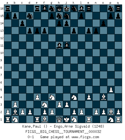 Last move : 0-1 2009 March 16 10:58:12 [Event "FICGS__BIG_CHESS__TOURNAMENT__000032"] [Site "FICGS"] [Date "2009.01.07"] [Round "1"] [White "Kane,Paul"] [Black "Engo,Arne Sigvald"] [Result "0-1"] [WhiteElo ""] [BlackElo "1248"] 1.b2-b3 n15-n13 2.c1-b2 o15-o14 3.p2-p4 d15-d13 4.o1-p2 c15-c14 5.p4-p5 o16-j11 6.m2-m4 c16-h11 7.e2-e4 k15-k13 8.j2-k4 e15-e13 9.l1-o4 b16-d15 10.h2-g4 m15-m13 11.g1-f3 f15-f13 0-1 This big chess game has been lost on time (started : 2009.01.07 11:4:19) Follow this game move after move (download)We don't really know how the game was invented, though there are suspicions. As soon as we discover the culprits, we'll let you know. (Bruce Pandolfini) Die starken Figuren des Gegners muss man abtauschen. (José Raúl Capablanca) Robert Fischer es la ley hacia si mismo. (Larry Evans) Botvinnik disait en comparant les échecs à la musique: Il existe une science dont le but est l'étude de l'acoustique et des sons. Mais il y a aussi un art qui se sert de l'océan des sons : c'est la musique. De toute évidence, il en est de même pour la pensée. La logique est l'étude des lois de la réflexion et les échecs reflètent, en tant qu'art, le côté logique de la réflexion, sous la forme d'images artistiques... Extrait de Fischer - Spassky, Reykjavik 1972 par Alexander & F. Wyndham (Ed. Solar), p 37. There are three kinds of lies: lies, damned lies and statistics. (Mark Twain)