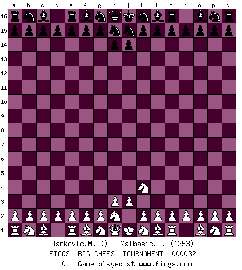 Last move : 1-0 2009 February 7 8:42:3 [Event "FICGS__BIG_CHESS__TOURNAMENT__000032"] [Site "FICGS"] [Date "2009.01.07"] [Round "1"] [White "Jankovic,Mladen"] [Black "Malbasic,Ljubisa"] [Result "1-0"] [WhiteElo ""] [BlackElo "1253"] 1.j2-k4 1-0 This big chess game has been lost on time (started : 2009.01.07 11:4:19) Follow this game move after move (download)A player surprised is half beaten. (Proverb) Kann Schach nicht schließlich das Nationalspiel der Deutschen werden? Und welche weiteren Ausblicke bieten sich dann dar! Welche Hebung des allgemeinen Kultur-Niveaus, ja der Moral, wenn das Schachbrett den Kartentisch verdrängen würde! Wahrlich, ein Ziel, des Schweißes der Edlen wert! (Siegbert Tarrasch) No es una movida, aún la mejor movida que tu debas buscar, sino un plan comprensible. (Eugene Znosko-Borovsky) Nous sommes les pions de la mystérieuse partie d'Echecs jouée par Dieu. Il nous déplace, nous arrête, nous pousse encore, puis nous lance un à un dans la boîte du Néant. Epitaphe sur la tombe de David Janowsky (1868-1927). If you have any trouble condescending, find a Unix user to show you how it's done. (Scott Adams)