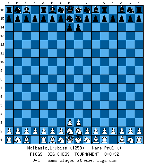 Last move : 0-1 2009 February 7 8:42:3 [Event "FICGS__BIG_CHESS__TOURNAMENT__000032"] [Site "FICGS"] [Date "2009.01.07"] [Round "1"] [White "Malbasic,Ljubisa"] [Black "Kane,Paul"] [Result "0-1"] [WhiteElo "1253"] [BlackElo ""] 0-1 This big chess game has been lost on time (started : 2009.01.07 11:4:19) Follow this game move after move (download)A Chess game is a dialogue, a conversation between a player and his opponent. Each move by the opponent may contain threats or be a blunder, but a player cannot defend against threats or take advantage of blunders if he does not first ask himself: What is my opponent planning after each move ? (Bruce A. Moon) Mein Gehirn das ist mein zweitwichtigstes Organ [Aus dem Film: Der Schläfer]. (Woody Allen) Cada Peón es potencialmente una Reina. (James Mason) Aux échecs, l'amour-propre est satisfait quand on remporte la victoire, mais il n'y a pas de honte à être battu. (Benjamin Franklin) There is far too much law for those who can afford it and far too little for those who cannot. (Derek Bok)