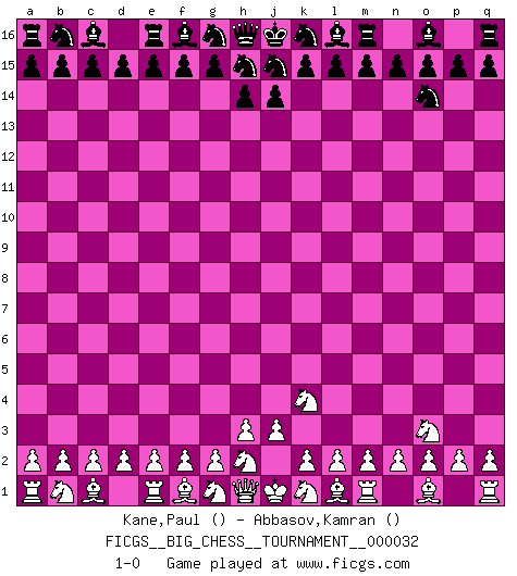 Last move : 1-0 2009 February 8 8:47:37 [Event "FICGS__BIG_CHESS__TOURNAMENT__000032"] [Site "FICGS"] [Date "2009.01.07"] [Round "1"] [White "Kane,Paul"] [Black "Abbasov,Kamran"] [Result "1-0"] [WhiteElo ""] [BlackElo ""] 1.p1-o3 p16-o14 2.j2-k4 1-0 This big chess game has been lost on time (started : 2009.01.07 11:4:19) Follow this game move after move (download)Those who say they understand Chess, understand nothing. (Robert Hubner) Das ganze Leben mit einer Ehefrau ist wie ein Endspiel mit ungleichfarbigen Läufern. (Viktor Kortschnoi) La belleza de un movimiento no se refleja solo en su apariencia, sino en el pensamiento detrás de él. (Siegbert Tarrasch) On est toujours la mazette de quelqu'un d'autre. (Anonyme) Remember : Your focus determines your reality. (Qui-Gon Jinn in Star Wars ep.1)