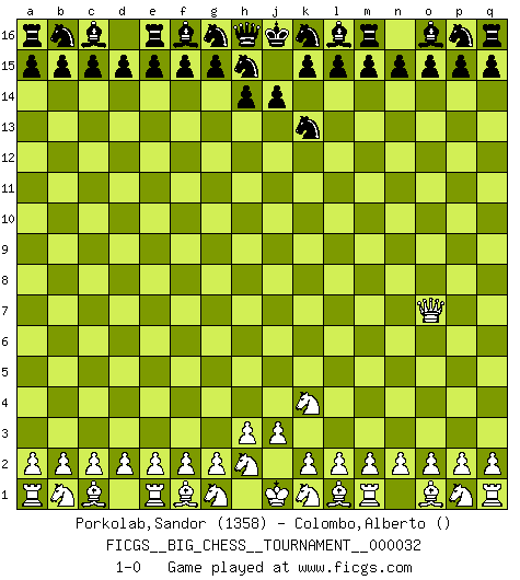 Last move : 1-0 2009 February 9 20:54:10 [Event "FICGS__BIG_CHESS__TOURNAMENT__000032"] [Site "FICGS"] [Date "2009.01.07"] [Round "1"] [White "Porkolab,Sandor"] [Black "Colombo,Alberto"] [Result "1-0"] [WhiteElo "1358"] [BlackElo ""] 1.j2-k4 j15-k13 2.h1-o7 1-0 This big chess game has been lost on time (started : 2009.01.07 11:4:19) Follow this game move after move (download)Chess is mental torture. (Garry Kasparov) Ohne Leiden bildet sich kein Charakter. (Ernst Freiherr von Feuchtersleben) Yo tuve un dolor de muelas en la primer partida. En el segundo juego, tuve un dolor de cabeza. En el tercero, tuve un ataque de reumatísmo. En la cuarta partida, no me sentía muy bien. ¿Y en el quinto juego? Bueno, ¿que acaso uno tiene que ganar todos los juegos?. (Siegbert Tarrasch) Les échecs c'est le défi de l'alpiniste, toujours plus haut, prêt à tout pour monter à l'assaut du Roi ennemi. Les échecs, c'est de la musique en mouvement, un ballet majestueux pour les yeux. C'est de la poésie composée par les fantômes du passé qui au même titre que Rimbaud ou Verlaine méritent notre admiration. Les échecs, c'est de la peinture ou le moindre mouvement modifie le tableau pour en faire un Picasso ou un Van Gogh. Les échecs, c'est tout et rien, c'est la vie et la mort. Jjulie33 sur le forum de France-Echecs. The problem with troubleshooting is that trouble shoots back. (Anonymous)