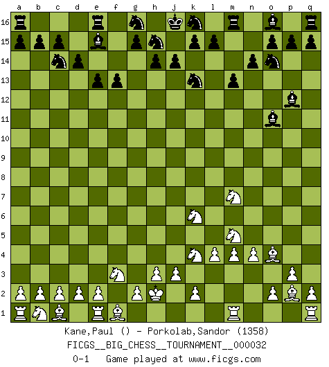 Last move : 0-1 2009 March 14 10:41:6 [Event "FICGS__BIG_CHESS__TOURNAMENT__000032"] [Site "FICGS"] [Date "2009.01.07"] [Round "1"] [White "Kane,Paul"] [Black "Porkolab,Sandor"] [Result "0-1"] [WhiteElo ""] [BlackElo "1358"] 1.p2-p3 j15-k13 2.o1-p2 h16-o10 3.p1-o3 o10-f2 4.g1-f3 f2-n9 5.k1-l3 m15-m13 6.m2-m4 p16-o14 7.n2-n4 l16-p12 8.l1-o4 n15-n14 9.j2-k4 d15-d14 10.h2-j4 c16-l8 11.l3-m5 e15-e13 12.o3-n5 f15-f13 13.j4-k6 l8-o11 14.l2-l4 b16-c14 15.n5-m7 n9-a9 16.h1-h2 a9-h2 17.j1-h2 f16-e15 0-1 This big chess game has been lost on time (started : 2009.01.07 11:4:19) Follow this game move after move (download)Castle early and often. (Rob Sillars) Je mehr wir mit Computern analysieren, desto mehr glauben wir an Verteidigung. (Vladimir Kramnik) Un entendimiento minucioso de las típicas continuaciones de mate hacen de las mas complicadas combinaciones de sacrificio que conducen hacia ellas no solo no dificiles, sino casi un asunto de rutina. (Siegbert Tarrasch) Un journaliste : 'Vous préférez avoir une dame de plus sur l'échiquier ou au lit ?' Boris Spassky : 'Ca dépend de la position.' Question: Is 'This statement is paradoxical' a paradoxical statement ? Or is it a meta-paradox ? (Normajean Yates)