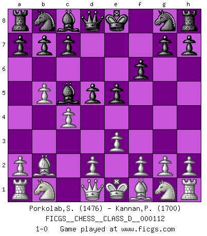 Last move : 1-0 2009 March 3 10:7:22 [Event "FICGS__CHESS__CLASS_D__000112"] [Site "FICGS"] [Date "2009.01.07"] [Round "1"] [White "Porkolab,Sandor"] [Black "Kannan,Pradyumna"] [Result "1-0"] [WhiteElo "1476"] [BlackElo "1700"] 1.b4 e5 2.Bb2 f6 3.b5 d5 4.e3 Bc5 5.c4 1-0 This chess game has been lost on time (started : 2009.01.07 11:22:32) Polish (Sokolsky) opening Player White won this chess game. Follow this game move after move (download)Modern Chess is too much concerned with things like Pawn structure. Forget it, Checkmate ends the game. (Nigel Short) Man gibt nur Pakete auf. (Paul Keres) Aquellos que dicen entender al Ajedrez, no entienden nada. (Robert Hubner) Ce qui caractérise les parties de combat, c'est que si le défenseur a constamment de difficiles problèmes à résoudre, l'attaquant doit chercher sans relâche de nouvelles possibilités d'attaque. (Koblentz) Industry executives and analysts often mistakenly talk about strategy as if it were some kind of chess match. But in chess, you have just two opponents, each with identical resources, and with luck playing a minimal role. The real world is much more like a poker game, with multiple players trying to make the best of whatever hand fortune has dealt them. In our industry, Bill Gates owns the table until someone proves otherwise. (David Moschella, 'Computerworld')