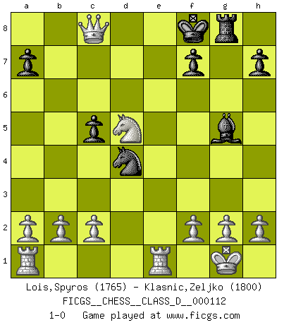 Last move : 1-0 2009 February 18 19:38:42 [Event "FICGS__CHESS__CLASS_D__000112"] [Site "FICGS"] [Date "2009.01.07"] [Round "1"] [White "Lois,Spyros"] [Black "Klasnic,Zeljko"] [Result "1-0"] [WhiteElo "1765"] [BlackElo "1800"] 1.e4 e5 2.Nf3 b6 3.Nxe5 Qe7 4.d4 d6 5.Nf3 Qxe4+ 6.Be2 Bg4 7.O-O c5 8.Re1 Be7 9.Bb5+ Qc6 10.Bxc6+ Nxc6 11.dxc5 Nf6 12.Qxd6 Rc8 13.Bg5 Bxf3 14.Bxf6 gxf6 15.Qxf6 Rg8 16.Qxf3 bxc5 17.Nc3 Kf8 18.Nd5 Nd4 19.Qh3 Bg5 20.Qxc8+ 1-0 King's knight Opening Kingside Castling by player White (move 7) Player White won this chess game. Follow this game move after move (download)Everything is in a state of flux, and this includes the world of Chess. (Mikhail Botvinnik) Die Jungen erwarten, dass Opa einfach umfällt. Dann aber kann Opa fünf Stunden lang Schach spielen und die jungen Gegner an die Wand drücken. (Viktor Kortschnoi) Combinaciones deslumbrantes son para la mayoría, mover madera es para los pocos. (Georg Kieninger) Le joueur d'Echecs qui veut atteindre le top est obligé de développer son propre credo créatif. Alexeï Stepanovicth Souétine. Il est facile d'écrire des livres ! Ce qui est difficile, c'est de jouer ! (Alexeï Stepanovicth Souétine) If passion drives you, let reason holds the reins. (Benjamin Franklin)