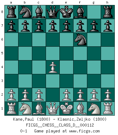 Last move : 0-1 2009 March 26 0:0:41 [Event "FICGS__CHESS__CLASS_D__000112"] [Site "FICGS"] [Date "2009.01.07"] [Round "1"] [White "Kane,Paul"] [Black "Klasnic,Zeljko"] [Result "0-1"] [WhiteElo "1800"] [BlackElo "1800"] 1.d4 Nf6 0-1 This chess game has been lost on time (started : 2009.01.07 11:22:32) Queen's pawn game Player Black won this chess game. Follow this game move after move (download)No other master has such a terrific will to win. At the board he radiates danger, and even the strongest opponents tend to freeze, like rabbits when they smell a panther. Even his weaknesses are dangerous. As white, his opening game is predictable - you can make plans against it - but so strong that your plans almost never work. In the middle game his precision and invention are fabulous, and in the end game you simply cannot beat him. (Anonymous German Expert) Kein Schachspieler kann gut schlafen. (H. G. Wells) En la vida, como en el Ajedrez, los Peones propios obstruyen nuestro camino. La gran fortuna de un hombre, su comodidad, placer, hijos, libros, que deberían ayudarle a ganar, con mucha frecuencia lo ponen en Jaque Mate. (Charles Buxton) Aux échecs, l'amour-propre est satisfait quand on remporte la victoire, mais il n'y a pas de honte à être battu. (Benjamin Franklin) Warrior pose battles inner weakness and wins focus. You see that there is no war within you. You're on your own side, and you are your own strength. (Terri Guillemets)