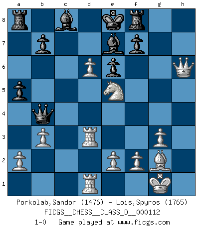 Last move : 1-0 2009 March 3 18:51:27 [Event "FICGS__CHESS__CLASS_D__000112"] [Site "FICGS"] [Date "2009.01.07"] [Round "1"] [White "Porkolab,Sandor"] [Black "Lois,Spyros"] [Result "1-0"] [WhiteElo "1476"] [BlackElo "1765"] 1.d4 d5 2.c4 e6 3.g3 Nf6 4.Bg2 Nbd7 5.Nf3 c6 6.Qc2 Bb4+ 7.Bd2 Qa5 8.O-O Ne4 9.Bf4 Ndf6 10.Ne5 g5 11.Be3 Be7 12.Nd2 Qa6 13.Nxe4 dxe4 14.Bxg5 Rg8 15.Qd2 e3 16.Bxe3 h5 17.Rfd1 h4 18.Bh6 hxg3 19.hxg3 Ng4 20.Qf4 Nxh6 21.Qxh6 Rf8 22.Rd3 Qb6 23.Rad1 a6 24.b3 a5 25.d5 cxd5 26.cxd5 Qb4 27.d6 1-0 Queen's gambit declined Kingside Castling by player White (move 8) Player White won this chess game. Follow this game move after move (download)My style is somewhere between that of Tal and Petrosian. (Reshevsky) Ein Großmeister muß tausende Partien in seinem Kopf speichern, denn diese sind für Ihn, was die Worte der Muttersprache für gewöhnliche Leute sind, oder Noten für Musiker... (Garry Kasparov) Me siento como si fuera una pieza en una partida de Ajedrez, cuando mi oponente me indica: esa pieza no puede ser movida. (Soren Kierkegaard) Si je n'étais pas joueur d'échecs, je serais le meilleur dans quelque chose d'autre. (Anatoli Karpov) Ah, the Socrating method. The best way we have of teaching everything-apart from juggling chainsaws. (Gregory House, House M.D.)
