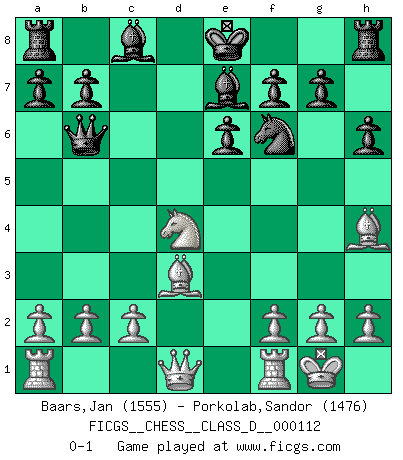 Last move : 0-1 2009 March 4 0:10:22 [Event "FICGS__CHESS__CLASS_D__000112"] [Site "FICGS"] [Date "2009.01.07"] [Round "1"] [White "Baars,Jan"] [Black "Porkolab,Sandor"] [Result "0-1"] [WhiteElo "1555"] [BlackElo "1476"] 1.e4 e6 2.d4 d5 3.Nc3 Nf6 4.Bg5 dxe4 5.Nxe4 Nbd7 6.Nf3 h6 7.Bh4 Be7 8.Nxf6+ Nxf6 9.Bd3 c5 10.O-O cxd4 11.Nxd4 Qb6 0-1 French : Burn variation Kingside Castling by player White (move 10) Player Black won this chess game. Follow this game move after move (download)Before the endgame, the Gods have placed the middle game. (Siegbert Tarrasch) Die starken Figuren des Gegners muss man abtauschen. (José Raúl Capablanca) Ciertamente el estado mental actual de Bobby Fischer es una tragedia. Uno de los mas grandes jugadores de Ajedrez del mundo -el orgullo y pena del Ajedrez Americano. (Frank Brady) La tactique est l'élément le plus important du milieu de jeu. (Siegbert Tarrasch) Only sick music makes money today. (Friedrich Nietzsche)