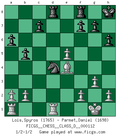 Last move : 1/2-1/2 2009 March 9 14:59:10 [Event "FICGS__CHESS__CLASS_D__000112"] [Site "FICGS"] [Date "2009.01.07"] [Round "1"] [White "Lois,Spyros"] [Black "Parmet,Daniel"] [Result "1/2-1/2"] [WhiteElo "1765"] [BlackElo "1698"] 1.e4 e5 2.Nf3 Nc6 3.Bb5 Nf6 4.O-O Nxe4 5.d4 a6 6.Ba4 b5 7.Bb3 d5 8.dxe5 Be6 9.Nbd2 Nc5 10.c3 Be7 11.Bc2 d4 12.cxd4 Nxd4 13.Nxd4 Qxd4 14.Nf3 Qxd1 15.Rxd1 O-O 16.Bg5 Bxg5 17.Nxg5 h6 18.Bh7+ Kh8 19.Nxe6 Nxe6 20.Be4 Rad8 21.g3 Nd4 1/2-1/2 Ruy Lopez : Berlin defense, Rosenthal variation Kingside Castling by player White (move 4) Kingside Castling by player Black (move 15) This chess game ended in a draw. Follow this game move after move (download)Chess is a fairy tale of 1001 blunders. (Savielly Tartakower) Wenn ich gewinne bin ich ein Genie. Wenn nicht, dann bin ich keines. (Robert James Fischer) Todo lo que importa ante el tablero de Ajedrez son buenas jugadas. (Bobby Fischer) Le thème de l'attaque double intervient d'une manière ou d'une autre dans l'immense majorité des combinaisons. (Youri Averbakh) When you stop learning you start dying. (M. Scott Adams)