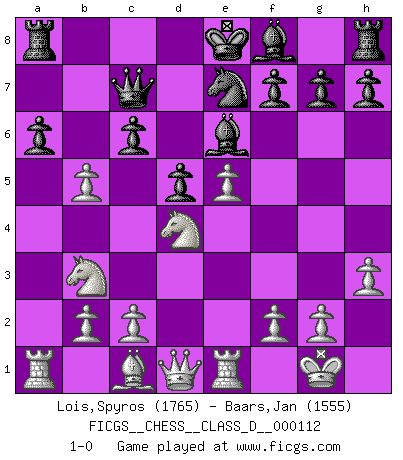 Last move : 1-0 2009 February 11 18:27:0 [Event "FICGS__CHESS__CLASS_D__000112"] [Site "FICGS"] [Date "2009.01.07"] [Round "1"] [White "Lois,Spyros"] [Black "Baars,Jan"] [Result "1-0"] [WhiteElo "1765"] [BlackElo "1555"] 1.e4 e5 2.Nf3 Nc6 3.Bb5 a6 4.Ba4 Nf6 5.O-O b5 6.Bb3 Nxe4 7.d4 d5 8.a4 Bg4 9.dxe5 Ne7 10.h3 Be6 11.Nbd2 Nc5 12.Nd4 Nxb3 13.N2xb3 c6 14.Re1 Qc7 15.axb5 1-0 Ruy Lopez : 5.O-O Kingside Castling by player White (move 5) Player White won this chess game. Follow this game move after move (download)I love all positions. Give me a difficult positional game, I will play it. But totally won positions, I cannot stand them. (Hein Donner) Es macht mich traurig, wenn ich sehe, dass Golfprofis mehr verdienen als Schachsportler. Obwohl ich davon überzeugt bin, dass wir Schachspieler viel härter trainieren müssen als die Golfer. (Alexandra Kosteniuk) El sobresalir en el Ajedrez es un signo de una mente intrigante. (Sir Arthur Conan Doyle) D'abord les bases : Jouez et étudiez, puis étudiez et jouez, ensuite jouez et étudiez, puis étudiez et jouez. Deuxièmement : Donnez toujours le meilleur de vous-même ! (Ken Smith) Don't be irreplaceable, if you can't be replaced, you can't be promoted. (Dan Rotaru)