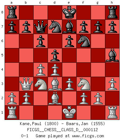 Last move : 0-1 2009 March 19 11:22:54 [Event "FICGS__CHESS__CLASS_D__000112"] [Site "FICGS"] [Date "2009.01.07"] [Round "1"] [White "Kane,Paul"] [Black "Baars,Jan"] [Result "0-1"] [WhiteElo "1800"] [BlackElo "1555"] 1.d4 d5 2.Nf3 Nf6 3.e3 c6 4.Bd3 Bg4 5.h3 Bh5 6.c4 e6 7.Qb3 Qc7 8.Nc3 Nbd7 9.Bd2 Be7 0-1 This chess game has been lost on time (started : 2009.01.07 11:22:32) Queen's pawn game Player Black won this chess game. Follow this game move after move (download)There is no remorse like the remorse of Chess. (H. G. Wells) Es gibt nur zwei wahre Schachgenies - das andere war Wilhelm Steinitz, der Weltmeister von 1872 bis 1894. (Robert James Fischer) Solo los afeminados hacen el Enroque. (Rob Sillars) Les échecs sont un jeu par leur forme, un art par leur essence et une science par sa difficulté d'acquisition. Ils peuvent vous procurer autant de plaisir qu'un bon livre ou une belle musique, mais vous n'aurez une réelle joie que si vous arrivez à bien jouer. (Tigran Petrosian) Wisdom begins at the end. (Daniel Webster)