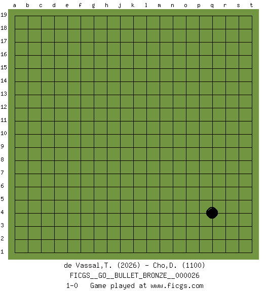 Last move : 1-0 2010 April 29 19:38:41 [Event "FICGS__GO__BULLET_BRONZE__000026"] [Site "FICGS"] [Date "2010.04.29"] [Round "1"] [Black "de Vassal,Thibault"] [White "Cho,Dennis Anne"] [Result "1-0"] [Rating 1 "2026"] [Rating 2 "1100"] 1.q4 1-0 This go game has been lost on time (started : 2010.04.29 14:2:39) Here are the names of the openings (joseki) played in the four corners : Corner q4 : q4 1-0 Hoshi (Hwajeom, Seongjeom, Xingwei`) 4-4 Point. The star or hoshi (4-4) point, emphasizing influence at the potential expense of territory. Player Black won this Go (weiqi, baduk) game. Follow this game move after move (download)Five groups might live but the six will die. (Anonymous) True nature is revealed in times of difficulty. (Chinese proverb)
