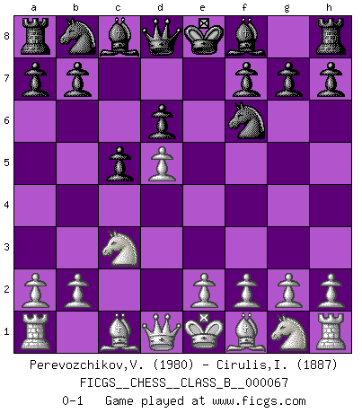 Last move : 0-1 2009 January 16 13:26:59 [Event "FICGS__CHESS__CLASS_B__000067"] [Site "FICGS"] [Date "2009.01.07"] [Round "1"] [White "Perevozchikov,Vjacheslav"] [Black "Cirulis,Ilmars"] [Result "0-1"] [WhiteElo "1980"] [BlackElo "1887"] 1.d4 e6 2.c4 c5 3.d5 exd5 4.cxd5 d6 5.Nc3 Nf6 0-1 Queen's pawn Player Black won this chess game. Follow this game move after move (download)Chess is like life. (Boris Spassky) Ein typischer, sehr verbreiteter Gedankenschädling ist der, daß der betreffende Amateur von der Annanhme ausgeht, daß jeder einzelne Zug etwas zu leisten habe. (Aaron Nimzowitsch) El Ajedrez es un cuento de Hadas de las 1001 metidas de pata. (Savielly Tartakower) La menace est plus forte que l'exécution. (Aaron Nimzovitch) Creativity is inventing, experimenting, growing, taking risks, breaking rules, making mistakes, and having fun. (Mary Lou Cook)