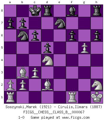 Last move : 1-0 2009 February 22 0:45:18 [Event "FICGS__CHESS__CLASS_B__000067"] [Site "FICGS"] [Date "2009.01.07"] [Round "1"] [White "Soszynski,Marek"] [Black "Cirulis,Ilmars"] [Result "1-0"] [WhiteElo "1921"] [BlackElo "1887"] 1.e4 e5 2.Nf3 Nf6 3.Nxe5 Qe7 4.d4 d6 5.Nf3 Qxe4+ 6.Be2 Bf5 7.Na3 Nc6 8.O-O Bg4 9.h3 Bh5 10.g4 Bxg4 11.hxg4 Qxg4+ 12.Kh1 O-O-O 13.d5 Qh5+ 14.Nh2 Qxd5+ 15.Qxd5 Nxd5 16.Bc4 Nce7 17.c3 f6 18.Nb5 c6 19.Nd4 g5 20.f4 h6 21.Bd2 Nb6 22.Bb3 d5 23.fxg5 1-0 Petrov's defense Kingside Castling by player White (move 8) Queenside Castling by player Black (move 12) Player White won this chess game. Follow this game move after move (download)One doesn't have to play well, it's enough to play better than your opponent. (Siegbert Tarrasch) Dieses schreckliche Gefühl, dass ich gegen eine Maschine spielte, die niemals Fehler macht, zerschmetterte meinen Widerstand. (Mark Taimanov) El jugador blanco perdió porque fallo en recordar la coreccta continuación y tuvo que pensar por sí mismo las movidas. (Siegbert Tarrasch) Celui qui prend des risques peut perdre, celui qui n'en prend pas perd toujours. (Xavier Tartacover) There are three kinds of lies: lies, damned lies and statistics. (Mark Twain)