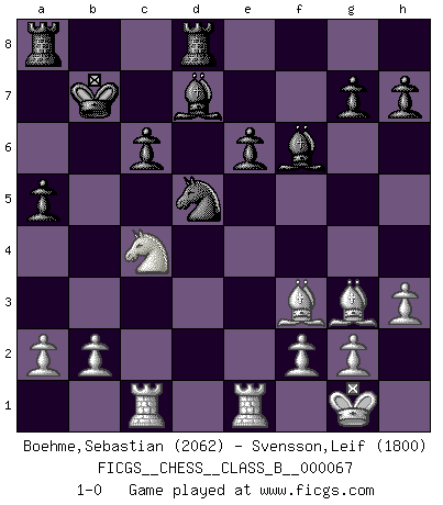 Last move : 1-0 2009 October 8 20:59:22 [Event "FICGS__CHESS__CLASS_B__000067"] [Site "FICGS"] [Date "2009.01.07"] [Round "1"] [White "Boehme,Sebastian"] [Black "Svensson,Leif"] [Result "1-0"] [WhiteElo "2062"] [BlackElo "1800"] 1.e4 Nf6 2.e5 Nd5 3.d4 d6 4.Nf3 dxe5 5.Nxe5 Nd7 6.Nxf7 Kxf7 7.Qh5+ Ke6 8.c4 N5f6 9.d5+ Kd6 10.Qf7 Nb8 11.c5+ Kd7 12.Bb5+ c6 13.dxc6+ bxc6 14.O-O Qa5 15.Rd1+ Kc7 16.Bf4+ Kb7 17.Be2 Qb4 18.Bd2 Qxc5 19.Be3 Qb4 20.Na3 Bd7 21.Nc4 e6 22.Bf4 Nd5 23.Bxb8 Qe7 24.Qxe7 Bxe7 25.Be5 Bf6 26.Bg3 a5 27.Rac1 Rhd8 28.Bf3 Be7 29.Re1 Bf6 30.h3 1-0 Alekhine's defense : Modern, Larsen variation Kingside Castling by player White (move 14) Player White won this chess game. Follow this game move after move (download)Bobby Fischer is the greatest Chess genius of all time ! (Alexander Kotov) Die Partien sind immer verschieden, die Interviews immer die gleichen. (Garry Kasparov) El hombre es un frívolo, una creatura engañosa y como un jugador de Ajedrez, se preocupa mas por el proceso de obtener su meta que de la meta por sí misma. (Dostoyevsky) Les Echecs, c'est l'art de la guerre sans les charniers, c'est la résurrection des morts tombés au champ d'honneur, l'espoir perpétuel, la suprématie de l'intelligence sur la force, la culture de l'esprit. (F. Szpiner) Lamb in skin of tiger, still fears the wolf. (Chinese proverb)