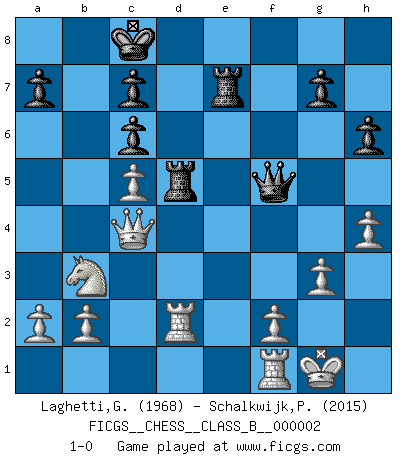 Last move : 1-0 2006 June 29 5:45:4 [Event "FICGS__CHESS__CLASS_B__000002"] [Site "FICGS"] [Date "2006.04.16"] [Round "1"] [White "Laghetti,Gaetano"] [Black "Schalkwijk,Peter"] [Result "1-0"] [WhiteElo "1968"] [BlackElo "2015"] 1.d4 d5 2.c4 e5 3.dxe5 d4 4.Nf3 Nc6 5.g3 f6 6.exf6 Qxf6 7.Bg2 Bg4 8.h3 Bxf3 9.Bxf3 Bb4+ 10.Nd2 O-O-O 11.O-O d3 12.exd3 Rxd3 13.Qe2 Rd8 14.Nb3 Nge7 15.c5 Rhe8 16.Bg2 Qf7 17.Bg5 Qf5 18.h4 h6 19.Bxe7 Rxe7 20.Qc4 Bd2 21.Bxc6 bxc6 22.Rad1 Rd5 23.Rxd2 1-0 QGD : Albin counter-gambit, 5.g3 Queenside Castling by player Black (move 10) Kingside Castling by player White (move 11) Player White won this chess game. Follow this game move after move (download)Chess problems demand from the composer the same virtues that characterize all worthwhile art: originality, invention, conciseness, harmony, complexity, and splendid insincerity. (Vladimir Nabokov) Fallen sollten polizeilich verboten werden. (Savielly Grigorievitsch Tartakower) Los finales de Peón son del Ajedrez lo que el cesped es del Golf. (Cecil Purdy) Ne tendez aucun piège pour le plaisir ! Ne jouez rien dans l'espoir que l'adversaire réagisse de façon stupide ! Prenez toujours pour acquis que l'adversaire va trouver le meilleur coup ! Ne jouez jamais de coup dans l'espoir que l'adversaire ne voie pas la menace ! Chacun de vos coups doit améliorer la position d'une façon ou d'une autre. Sometimes it pays to stay in bed in Monday, rather than spending the rest of the week debugging Monday's code. (Dan Salomon)
