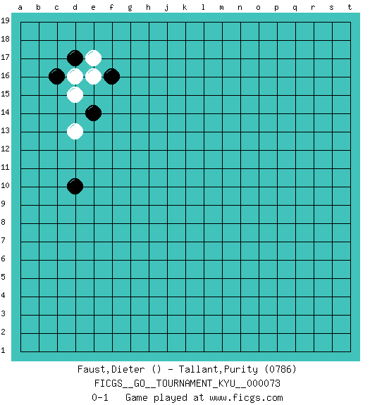 Last move : 0-1 2009 January 18 9:28:45 [Event "FICGS__GO__TOURNAMENT_KYU__000073"] [Site "FICGS"] [Date "2009.01.08"] [Round "1"] [Black "Faust,Dieter"] [White "Tallant,Purity"] [Result "0-1"] [Rating 2 "0786"] 1.d10 d16 2.e14 d15 3.d17 e17 4.c16 e16 5.f16 d13 0-1 Here are the names of the openings (joseki) played in the four corners : Corner d16 : d16 e14 Hoshi (Hwajeom, Seongjeom, Xingwei`) 4-4 Point. The star or hoshi (4-4) point, emphasizing influence at the potential expense of territory. Player White won this Go (weiqi, baduk) game. Follow this game move after move (download)One point in the center is worth ten in the corner. (Anonymous) Luck is when opportunity knocks and you answer. (Anonymous)