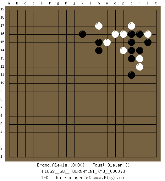 Last move : 1-0 2009 January 18 9:29:22 [Event "FICGS__GO__TOURNAMENT_KYU__000073"] [Site "FICGS"] [Date "2009.01.08"] [Round "1"] [Black "Bromo,Alexis"] [White "Faust,Dieter"] [Result "1-0"] [Rating 1 "0000"] 1.k16 m17 2.q16 o16 3.m15 n15 4.m14 q17 5.r16 r15 6.q15 p14 7.r14 r13 8.s15 s16 9.q13 p16 10.q14 r12 11.q11 1-0 Here are the names of the openings (joseki) played in the four corners : Corner q16 : m17 q16 This joseki is unknown. A weak or weird move has probably been played in this corner. Player Black won this Go (weiqi, baduk) game. Follow this game move after move (download)If there is no stone on the handicap point, the carpenter's square is dead. (Anonymous) Perhaps the current trend of many chess professionals taking up the more lucrative pastime of poker is not a wholly negative one. It may not be too late for humans to relearn how to take risks in order to innovate and thereby maintain the advanced lifestyles we enjoy. And if it takes a poker-playing supercomputer to remind us that we can't enjoy the rewards without taking the risks, so be it. (The Chess Master and the Computer, by Garry Kasparov - 2010)