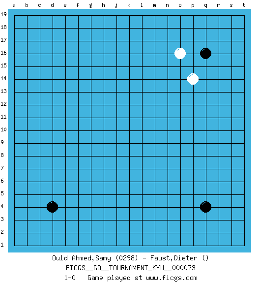 Last move : 1-0 2009 January 18 9:30:32 [Event "FICGS__GO__TOURNAMENT_KYU__000073"] [Site "FICGS"] [Date "2009.01.08"] [Round "1"] [Black "Ould Ahmed,Samy"] [White "Faust,Dieter"] [Result "1-0"] [Rating 1 "0298"] 1.q16 p14 2.d4 o16 3.q4 1-0 Here are the names of the openings (joseki) played in the four corners : Corner q16 : q16 p14 Hoshi (Hwajeom, Seongjeom, Xingwei`) 4-4 Point. The star or hoshi (4-4) point, emphasizing influence at the potential expense of territory. Corner q4 : q4 1-0 Hoshi (Hwajeom, Seongjeom, Xingwei`) 4-4 Point. The star or hoshi (4-4) point, emphasizing influence at the potential expense of territory. Player Black won this Go (weiqi, baduk) game. Follow this game move after move (download)Win the early ko to win the game. (Anonymous) Experiences are the keys to life. (Daniel Parmet)