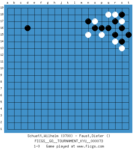 Last move : 1-0 2009 January 18 9:29:58 [Event "FICGS__GO__TOURNAMENT_KYU__000073"] [Site "FICGS"] [Date "2009.01.08"] [Round "1"] [Black "Schuett,Wilhelm"] [White "Faust,Dieter"] [Result "1-0"] [Rating 1 "0700"] 1.q16 r14 2.d16 p15 3.p16 o17 4.o16 n15 5.n17 r16 6.r17 q18 7.r15 s17 8.s16 r18 9.s18 s15 10.s14 s13 11.t15 1-0 Here are the names of the openings (joseki) played in the four corners : Corner q16 : q16 r14 Hoshi (Hwajeom, Seongjeom, Xingwei`) 4-4 Point. The star or hoshi (4-4) point, emphasizing influence at the potential expense of territory. Ikken Kakari (Hankan Keolch'im, Yi Gua`jiao~, 1-Space Low Approach). White 2 is the standard approach move to the 4-4. Player Black won this Go (weiqi, baduk) game. Follow this game move after move (download)Each step in a ladder is worth 7 points. (Anonymous) The best teachers teach from the heart, not from the book. (Author unknown)