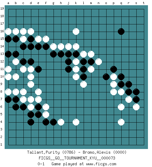 Last move : 0-1 2009 April 8 14:18:6 [Event "FICGS__GO__TOURNAMENT_KYU__000073"] [Site "FICGS"] [Date "2009.01.08"] [Round "1"] [Black "Tallant,Purity"] [White "Bromo,Alexis"] [Result "0-1"] [Rating 1 "0786"] [Rating 2 "0000"] 1.d4 d10 2.c6 d16 3.q16 q4 4.g4 k16 5.q10 q6 6.r8 q8 7.r9 r7 8.s7 s6 9.s8 k4 10.c9 d9 11.c10 p10 12.q9 p9 13.p11 p8 14.o10 c11 15.d8 e8 16.b11 b12 17.c12 d11 18.d12 b10 19.b13 a11 20.a13 c8 21.b9 b8 22.a9 a8 23.d7 e7 24.e6 f6 25.e5 f5 26.f4 h4 27.b7 a10 28.a7 c7 29.b6 d6 30.d5 d7 31.c14 c15 32.b15 b16 33.a15 a16 34.d15 c16 35.d14 e15 36.e14 f15 37.f14 g14 38.g13 h14 39.h13 j14 40.j13 k14 41.k13 l13 42.l12 m13 43.m12 k12 44.j12 k11 45.j11 k10 46.e11 n12 47.l11 m11 48.l10 l9 0-1 This go game has been lost on time (started : 2009.01.08 13:25:58) Here are the names of the openings (joseki) played in the four corners : Player White won this Go (weiqi, baduk) game. Follow this game move after move (download)When in doubt, remove the enemy stones from the board. (Bill Taylor) Wisdom doesn't necessarily come with age. Sometimes age just shows up all by itself. (Tom Watson)
