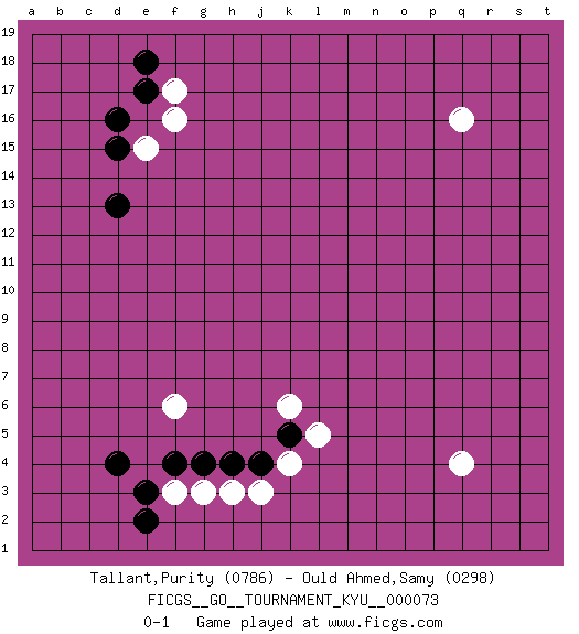 Last move : 0-1 2009 March 1 21:55:38 [Event "FICGS__GO__TOURNAMENT_KYU__000073"] [Site "FICGS"] [Date "2009.01.08"] [Round "1"] [Black "Tallant,Purity"] [White "Ould Ahmed,Samy"] [Result "0-1"] [Rating 1 "0786"] [Rating 2 "0298"] 1.d4 q16 2.d13 q4 3.d16 f3 4.e3 h3 5.e2 f16 6.e17 f17 7.e18 e15 8.d15 f6 9.f4 g3 10.g4 k4 11.h4 j3 12.j4 k6 13.k5 l5 0-1 This go game has been lost on time (started : 2009.01.08 13:25:58) Here are the names of the openings (joseki) played in the four corners : Corner d4 : d4 f3 Hoshi (Hwajeom, Seongjeom, Xingwei`) 4-4 Point. The star or hoshi (4-4) point, emphasizing influence at the potential expense of territory. Ikken Kakari (Hankan Keolch'im, Yi Gua`jiao~, 1-Space Low Approach). White 2 is the standard approach move to the 4-4. Player White won this Go (weiqi, baduk) game. Follow this game move after move (download)There is death in the hane. (Anonymous) Employ the attack like tactic of defense. (Chinese proverb)