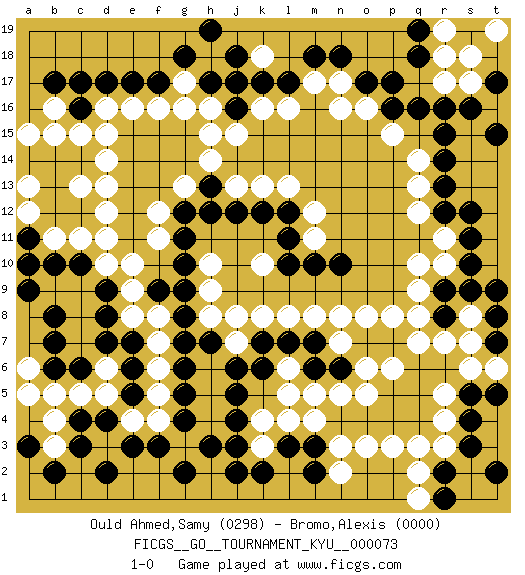 Last move : 1-0 2009 March 4 18:40:21 [Event "FICGS__GO__TOURNAMENT_KYU__000073"] [Site "FICGS"] [Date "2009.01.08"] [Round "1"] [Black "Ould Ahmed,Samy"] [White "Bromo,Alexis"] [Result "1-0"] [Rating 1 "0298"] [Rating 2 "0000"] 1.q16 k16 2.d4 d16 3.q4 d10 4.d7 k10 5.q7 q14 6.r15 p15 7.p17 o16 8.o17 q10 9.r9 q9 10.r8 k4 11.g4 h5 12.n4 m5 13.c14 d14 14.c12 d12 15.c10 c13 16.b13 d13 17.b14 c11 18.b12 b11 19.b10 d11 20.a11 c15 21.l3 c5 22.c6 d5 23.e5 d6 24.e6 c7 25.b6 b5 26.b7 c8 27.d8 c9 28.d9 b9 29.a10 a6 30.b8 e4 31.e3 f4 32.f3 f5 33.g5 f6 34.e7 d3 35.c4 b4 36.c3 g3 37.g6 f7 38.g8 e9 39.a9 f8 40.d2 b3 41.b2 m4 42.m3 l4 43.g7 e10 44.h3 k3 45.g2 n5 46.o4 o5 47.p5 b15 48.f9 e8 49.g10 a15 50.a14 a12 51.g12 g13 52.j12 m12 53.l12 l13 54.k12 k13 55.h13 h14 56.l17 l16 57.k17 m17 58.m18 n17 59.n18 j17 60.j18 h18 61.h17 k18 62.j16 j15 63.g18 h16 64.j17 h15 65.f17 f16 66.d17 e16 67.e17 g16 68.b17 f12 69.g11 f11 70.c16 b16 71.c17 d15 72.p16 n16 73.r14 q13 74.r13 q12 75.r12 r11 76.s11 r10 77.s10 q8 78.o7 o8 79.m7 n7 80.p7 p8 81.n6 n8 82.k7 o6 83.m6 l6 84.l7 l8 85.k6 l5 86.j5 h4 87.j4 h6 88.h7 p6 89.q6 j8 90.k2 g17 91.h19 m8 92.l11 k8 93.m10 j7 94.j6 r7 95.r6 s7 96.s9 s6 97.s5 r5 98.q5 r4 99.s4 r3 100.s3 q3 101.p4 p3 102.r2 n3 103.j3 o3 104.j2 n2 105.m2 q2 106.r1 q1 107.t2 a5 108.a3 a13 109.t8 s8 110.s12 r17 111.s16 s17 112.q18 r18 113.q19 r19 114.s19 s18 115.r16 t19 116.t17 t16 117.t15 h9 118.g9 h8 119.t7 t6 120.t9 q7 121.t5 h10 122.n10 m11 123.l10 j13 124.h12 1-0 Here are the names of the openings (joseki) played in the four corners : Corner q16 : q16 q14 Hoshi (Hwajeom, Seongjeom, Xingwei`) 4-4 Point. The star or hoshi (4-4) point, emphasizing influence at the potential expense of territory. Ikken Takagakari (Hankan Nop'dakeolch'im, Yi Gaojia, 1-Space High Approach). Black typically responds at 6-4 or 3-10. Black 4-10 is played when Black finds play on the right side advantageous. Black 4-8 or 3-8 may be played when Black has support at top. Corner d16 : d16 c14 Hoshi (Hwajeom, Seongjeom, Xingwei`) 4-4 Point. The star or hoshi (4-4) point, emphasizing influence at the potential expense of territory. Ikken Kakari (Hankan Keolch'im, Yi Gua`jiao~, 1-Space Low Approach). Black 2 is the standard approach move to the 4-4. Player Black won this Go (weiqi, baduk) game. Follow this game move after move (download)With less than 15 stones in danger, tenuki. (Anonymous) Strategy without tactics is the slowest route to victory. Tactics without strategy is the noise before defeat. (Sun Tzu)