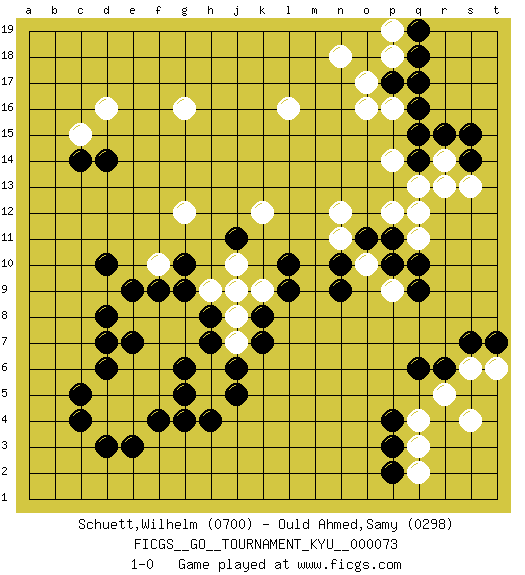 Last move : 1-0 2009 May 2 22:45:12 [Event "FICGS__GO__TOURNAMENT_KYU__000073 "] [Site "FICGS"] [Date "2009.01.08"] [Round "1"] [Black "Schuett,Wilhelm "] [White "Ould Ahmed,Samy "] [Result "1-0"] [Rating 1 "0700"] [Rating 2 "0298"] 1.q16 d4 2.c4 q4 3.d3 d5 4.c5 d16 5.d6 e4 6.e3 f5 7.f4 e5 8.g4 g7 9.r6 r5 10.q6 o16 11.p17 o17 12.p3 q3 13.p4 q2 14.p2 s6 15.s7 t6 16.t7 s4 17.q10 p14 18.q14 l16 19.c14 c15 20.d14 g16 21.d10 e8 22.d8 f10 23.j6 j10 24.l10 k12 25.k8 k9 26.l9 j8 27.k7 h5 28.g5 f6 29.g6 h6 30.j5 e6 31.h7 j7 32.h8 j9 33.h4 n12 34.e7 f7 35.d7 g8 36.g9 f8 37.f9 h9 38.e9 o10 39.n9 p9 40.q9 q12 41.p11 p12 42.o11 n11 43.n10 q11 44.p10 s13 45.s14 r14 46.r15 r13 47.s15 q13 48.q15 p16 49.q17 p18 50.q18 p19 51.q19 n18 52.g10 g12 53.j11 1-0 Here are the names of the openings (joseki) played in the four corners : Corner d4 : d4 c4Hoshi (Hwajeom, Seongjeom, Xingwei`) 4-4 Point. The star or hoshi (4-4) point, emphasizing influence at the potential expense of territory. Corner q4 : q4 r6Hoshi (Hwajeom, Seongjeom, Xingwei`) 4-4 Point. The star or hoshi (4-4) point, emphasizing influence at the potential expense of territory.Ikken Kakari (Hankan Keolch'im, Yi Gua`jiao~, 1-Space Low Approach). Black 2 is the standard approach move to the 4-4. Corner q16 : q16 o16Hoshi (Hwajeom, Seongjeom, Xingwei`) 4-4 Point. The star or hoshi (4-4) point, emphasizing influence at the potential expense of territory.Ikken Takagakari (Hankan Nop'dakeolch'im, Yi Gaojia, 1-Space High Approach). Black typically responds at 6-4 or 3-10. Black 4-10 is played when Black finds play on the right side advantageous. Black 4-8 or 3-8 may be played when Black has support at top. Corner d16 : d16 c14Hoshi (Hwajeom, Seongjeom, Xingwei`) 4-4 Point. The star or hoshi (4-4) point, emphasizing influence at the potential expense of territory.Ikken Kakari (Hankan Keolch'im, Yi Gua`jiao~, 1-Space Low Approach). Black 2 is the standard approach move to the 4-4. Player Black won this Go (weiqi, baduk) game.Follow this game move after move (download ) On the second line six die, eight live. (Anonymous) Big Chess is a place for big hallucinations. (Thibault de Vassal)