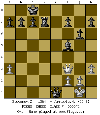 Last move : 0-1 2009 March 12 18:12:37 [Event "FICGS__CHESS__CLASS_F__000071"] [Site "FICGS"] [Date "2009.01.08"] [Round "1"] [White "Stoyanov,Zdravko"] [Black "Jankovic,Mladen"] [Result "0-1"] [WhiteElo "1364"] [BlackElo "1142"] 1.e4 e5 2.Nf3 Nc6 3.c3 d5 4.Bb5 dxe4 5.Nxe5 Qd5 6.Nxc6 Qxb5 7.Nd4 Qd5 8.O-O Nf6 9.Re1 Bf5 10.Qf3 g6 11.d3 O-O-O 12.dxe4 Nxe4 13.Qe3 Bc5 14.Qf4 Bxd4 15.cxd4 Qxd4 16.Qf3 Rhe8 17.h3 Rd7 18.Be3 Qxb2 19.Nd2 Nxd2 20.Bxd2 Rxe1+ 21.Rxe1 Qxd2 22.a3 Qxe1+ 0-1 Ponziani Opening Kingside Castling by player White (move 8) Queenside Castling by player Black (move 11) Player Black won this chess game. Follow this game move after move (download)Chess is a part of culture and if a culture is declining then Chess too will decline. (Mikhail Botvinnik) Unter Putin wird alles Geld aus Russland wie von einem Staubsauger nach Moskau umgeleitet, das ist wie ein schwarzes Loch. (Garry Kasparov) El Ajedrez expande y enriquece tu mente. (Saudin Robovic) Avec des compensations pour le matériel en plus... (Anonyme) The best weapon against an enemy is another enemy. (Friedrich Nietzsche)