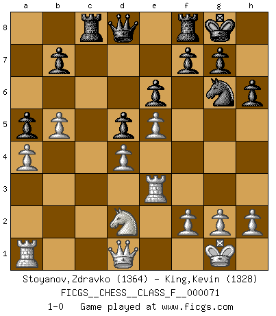 Last move : 1-0 2009 April 3 21:15:18 [Event "FICGS__CHESS__CLASS_F__000071"] [Site "FICGS"] [Date "2009.01.08"] [Round "1"] [White "Stoyanov,Zdravko"] [Black "King,Kevin"] [Result "1-0"] [WhiteElo "1364"] [BlackElo "1328"] 1.e4 e6 2.Nf3 d5 3.e5 c5 4.c3 Nc6 5.Bb5 Bd7 6.Bxc6 Bxc6 7.d4 cxd4 8.cxd4 Bb4+ 9.Bd2 Bxd2+ 10.Nbxd2 Ne7 11.O-O O-O 12.Re1 Rc8 13.b3 Bb5 14.a4 Bd3 15.Re3 Bg6 16.Nh4 h6 17.Nxg6 Nxg6 18.b4 a5 19.b5 1-0 This chess game has been lost on time (started : 2009.01.08 20:42:55) French defense Kingside Castling by player White (move 11) Kingside Castling by player Black (move 11) Player White won this chess game. Follow this game move after move (download)You cannot play at Chess if you are kind-hearted. (French Proverb) Wenn ich Weiß habe gewinne ich weil ich Weiß habe, wenn ich Schwarz habe gewinne ich weil ich Bogoljubov bin. (Efim Bogoljubov) El Ajedrez es imaginación. (David Bronstein) Que feriez-vous si vous étiez en train de jouer aux échecs et que la fin du monde arrive ? Je continuerais à jouer. (Saint Borromée) Statistics can be made to prove anything - even the truth. (Author unknown)