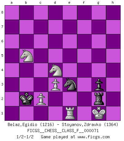 Last move : 1/2-1/2 2009 February 13 17:4:41 [Event "FICGS__CHESS__CLASS_F__000071"] [Site "FICGS"] [Date "2009.01.08"] [Round "1"] [White "Belaz,Egidio"] [Black "Stoyanov,Zdravko"] [Result "1/2-1/2"] [WhiteElo "1216"] [BlackElo "1364"] 1.e4 e5 2.f4 exf4 3.Nf3 a6 4.Bc4 d6 5.O-O h6 6.d3 Bg4 7.Bxf4 Qf6 8.Bg3 Qxb2 9.Nbd2 Nf6 10.Qe1 Nbd7 11.e5 dxe5 12.Bxe5 Nxe5 13.Nxe5 Be6 14.Bxe6 fxe6 15.Ng6 Qd4+ 16.Kh1 Rg8 17.Qxe6+ Kd8 18.Qxg8 Nxg8 19.Nxf8 Qg4 20.Rae1 c6 21.Ne4 Kc7 22.Rf7+ Kb6 23.Nd7+ Ka5 24.Ref1 Rd8 25.R7f5+ b5 26.Nec5 Re8 27.Nb3+ Ka4 28.R5f4+ Qxf4 29.Rxf4+ Ka3 30.h3 Kxa2 31.Ndc5 g5 32.Rf2 h5 33.Nxa6 g4 34.hxg4 hxg4 35.Nb4+ Kb2 36.Nxc6 g3 37.Rf1 Re2 38.Nbd4 Rd2 39.Nxb5 Nf6 40.Ncd4 Ng4 41.Kg1 Ne3 42.Re1 Rxg2+ 43.Kh1 Rh2+ 44.Kg1 Rg2+ 45.Kh1 Rh2+ 46.Kg1 Rg2+ 1/2-1/2 King's knight's gambit Kingside Castling by player White (move 5) 10 pieces endgame at move 42 : White KRNNPP , Black KRNP WHITE : King + 1 Rook 2 Knights 2 Pawns BLACK : King + 1 Rook 1 Knight 1 Pawn This chess game ended in a draw. Follow this game move after move (download)Avoid the crowd. Do your own thinking independently. Be the Chess player, not the Chess piece. (Ralph Charell) Im Wettkampf zwischen starken Meistern kommen Fehler sehr selten vor, deshalb ist es mit bloßem Warten nicht getan. (José Raúl Capablanca) No volvere nunca a jugar contigo. Has insultado a mi amigo. - cuando un oponente se maldijo por una mala jugada (Miguel Najdorf) Les écrivains ont utilisé les échecs pour analyser les côtés extrêmes de la nature humaine. Dans ce cadre, les échecs offrent un champ d'expérimentation idéal. Mais on pourrait faire la même chose avec la peinture. Et là, en vous référant à Van Gogh, vous ne tirerez pas de conclusion définitive sur les peintres. (Gary Kasparov) Life is painting a picture, not doing a sum. (Oliver Wendell Holmes, Jr.)