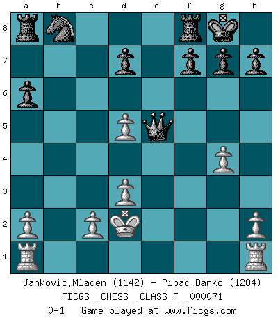 Last move : 0-1 2009 March 10 9:52:2 [Event "FICGS__CHESS__CLASS_F__000071"] [Site "FICGS"] [Date "2009.01.08"] [Round "1"] [White "Jankovic,Mladen"] [Black "Pipac,Darko"] [Result "0-1"] [WhiteElo "1142"] [BlackElo "1204"] 1.e4 e5 2.f4 exf4 3.Bc4 Qh4+ 4.Kf1 b5 5.Bxb5 Nf6 6.Nf3 Qh6 7.Nc3 Bb7 8.d3 Ng4 9.Ne2 a6 10.Bxf4 Ne3+ 11.Kf2 Nxd1+ 12.Ke1 Qb6 13.Kxd1 Qxb5 14.Bxc7 Qxb2 15.Be5 Qb4 16.Bc3 Qd6 17.Be5 Qe6 18.Nf4 Qh6 19.g3 Bd6 20.Nd5 Bxe5 21.Nxe5 Bxd5 22.exd5 Qh5+ 23.g4 Qxe5 24.Kd2 O-O 0-1 KGA : Bishop's gambit, Bryan counter-gambit Kingside Castling by player Black (move 24) Player Black won this chess game. Follow this game move after move (download)Chess is a foolish expedient for making idle people believe they are doing something very clever when they are only wasting their time. (George Bernard Shaw) Wer wird heute Abend ihr Gegner sein? -- Heute Abend spiele ich gegen die schwarzen Steine. (Akiba Rubinstein) Tu puedes aprender mucho mas de una partida que pierdas que de una partida ganada. Tendras que perder cientos de partidas antes de llegar a ser un buen jugador. (Jose Raul Capablanca) La vie et les Echecs sont tous les deux une lutte constante. (Lasker) Good luck. You're gonna need it. (Han Solo in Star Wars ep.6)