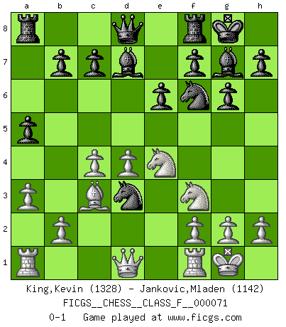 Last move : 0-1 2009 May 6 6:50:45 [Event "FICGS__CHESS__CLASS_F__000071"] [Site "FICGS"] [Date "2009.01.08"] [Round "1"] [White "King,Kevin"] [Black "Jankovic,Mladen"] [Result "0-1"] [WhiteElo "1328"] [BlackElo "1142"] 1.d4 Nf6 2.c4 g6 3.Nc3 Bg7 4.e3 d5 5.Nf3 e6 6.Bd3 O-O 7.O-O Bd7 8.e4 dxe4 9.Nxe4 Nc6 10.Bd2 a5 11.Bc3 Nb4 12.a3 Nxd3 0-1 King's Indian defense, 3.Nc3 Kingside Castling by player Black (move 6) Kingside Castling by player White (move 7) Player Black won this chess game. Follow this game move after move (download)Via the squares on the chessboard, the Indians explain the movement of time and the age, the higher influences which control the world and the ties which link Chess with the human soul. (Al-Masudi) Ein Teil des Fehlers ist immer korrekt. (Savielly Grigorievitsch Tartakower) El Ajedrez te enseña a controlarl la excitación inicial que sientes cuando vez algo que parece bueno y te enseña a pensar objetivamente cuando te encuentras en problemas. (Stanley Kubrick) Le profane ne songe pas à la somme de jouissance dont il se prive, qui méconnaît ce jeu aux ressources aussi variées que passionnantes. (Jean-Marie Jeanton-Lamarche) Before all elsed, be armed. (Niccolo Machiavelli)