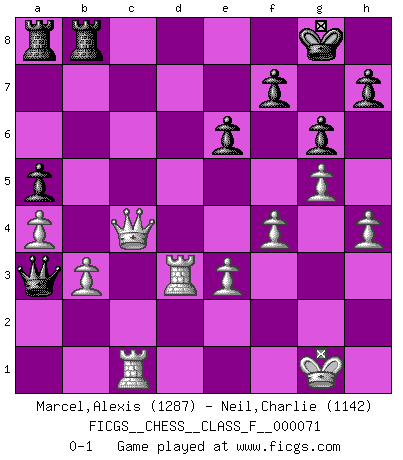 Last move : 0-1 2009 February 2 8:30:14 [Event "FICGS__CHESS__CLASS_F__000071"] [Site "FICGS"] [Date "2009.01.08"] [Round "1"] [White "Marcel,Alexis"] [Black "Neil,Charlie"] [Result "0-1"] [WhiteElo "1287"] [BlackElo "1142"] 1.f4 c5 2.Nf3 Nc6 3.b3 e6 4.Bb2 Nf6 5.e3 d5 6.Be2 Be7 7.O-O O-O 8.Nc3 a6 9.Na4 Bd7 10.Rc1 b5 11.Bxf6 Bxf6 12.Nc3 a5 13.Nxb5 Nb4 14.a4 Re8 15.c3 Nc6 16.Qc2 Ne7 17.Nd6 Rf8 18.Bb5 Bxb5 19.Nxb5 Nf5 20.g4 Nd6 21.Nxd6 Qxd6 22.g5 Be7 23.Ne5 Rfb8 24.h4 d4 25.cxd4 cxd4 26.Nc6 Re8 27.Nxe7+ Qxe7 28.Qc4 dxe3 29.dxe3 g6 30.Rfd1 Reb8 31.Rd3 Qa3 0-1 Bird's Opening Kingside Castling by player White (move 7) Kingside Castling by player Black (move 7) Player Black won this chess game. Follow this game move after move (download)Chess is a fighting game which is purely intellectual and includes chance. (Richard Reti) Alles was ich jemals tun will ist Schach spielen. (Robert James Fischer) Te sientas frente a un tablero y repentinamente tu corazón brinca. Tu mano tiembla al tomar una pieza y moverla. Pero lo que el Ajedrez te enseña es que tu debes permanecer ahí con calma y pensar de que si realmente es una buena idea o de que si hay otras ideas mejores. (Stanley Kubrick) L'ordinateur a tué l'originalité. Il n'y a plus guère d'aventures sur l'échiquier. (Jacob Murray) The general who wins the battle makes many calculations in his temple before the battle is fought. The general who loses makes but few calculations beforehand. (Sun Tzu)