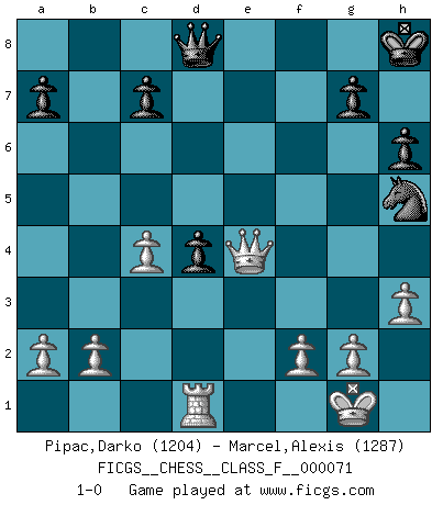 Last move : 1-0 2009 January 14 12:51:39 [Event "FICGS__CHESS__CLASS_F__000071"] [Site "FICGS"] [Date "2009.01.08"] [Round "1"] [White "Pipac,Darko"] [Black "Marcel,Alexis"] [Result "1-0"] [WhiteElo "1204"] [BlackElo "1287"] 1.e4 e5 2.Nf3 Nf6 3.Bc4 d6 4.d4 exd4 5.Qxd4 Nc6 6.Qe3 Be7 7.Ng5 O-O 8.Nxf7 Rxf7 9.Bxf7+ Kxf7 10.Qf3 Ne5 11.Qb3+ Kf8 12.Bg5 Nxe4 13.Bxe7+ Qxe7 14.O-O Nc5 15.Qe3 Bd7 16.Nc3 Kg8 17.Rad1 Re8 18.Nd5 Qd8 19.Rfe1 Ng4 20.Qf3 Rxe1+ 21.Rxe1 Bc6 22.Ne7+ Kh8 23.Nxc6 bxc6 24.Qxg4 Nd7 25.Qe6 Nf6 26.h3 h6 27.c4 d5 28.Qxc6 d4 29.Rd1 Nh5 30.Qe4 1-0 Petrov : Italian variation Kingside Castling by player Black (move 7) Kingside Castling by player White (move 14) Player White won this chess game. Follow this game move after move (download)Kasparov : J'adoube , Ivanchuk : S'il vous plaît ! (Garry Kasparov & Vassily Ivanchuk, Linares 1997) Die Jungen erwarten, dass Opa einfach umfällt. Dann aber kann Opa fünf Stunden lang Schach spielen und die jungen Gegner an die Wand drücken. (Viktor Kortschnoi) Morphy probablemente fue el genio más grande de todos. (Bobby Fischer) Même si l'adversaire joue le coup analysé précédemment, recommencez l'analyse en voyant la nouvelle position. Première règle de Blumenfeld Those parts of the system that you can hit with a hammer (not advised) are called hardware; those program instructions that you can only curse at are called software. (Anonymous)