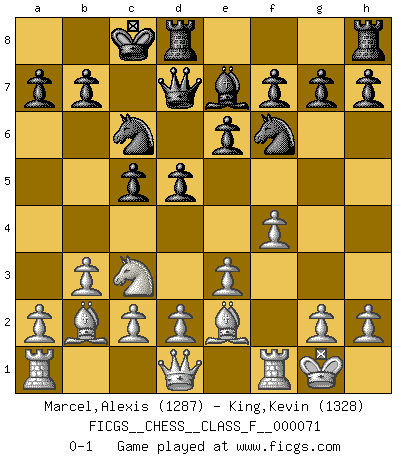 Last move : 0-1 2009 February 8 0:10:58 [Event "FICGS__CHESS__CLASS_F__000071"] [Site "FICGS"] [Date "2009.01.08"] [Round "1"] [White "Marcel,Alexis"] [Black "King,Kevin"] [Result "0-1"] [WhiteElo "1287"] [BlackElo "1328"] 1.f4 e6 2.Nf3 d5 3.e3 Nf6 4.Be2 c5 5.b3 Nc6 6.Bb2 Be7 7.O-O Bd7 8.Ne5 Qc7 9.Nxd7 Qxd7 10.Nc3 O-O-O 0-1 Bird's Opening Kingside Castling by player White (move 7) Queenside Castling by player Black (move 10) Player Black won this chess game. Follow this game move after move (download)I guess a certain amount of temperament is expected of Chess geniuses. (Ron Gross) Wenn sie aufgeben, dann danke ich Ihnen für das Spiel (Eventualzug beim Fernschach). (Anonymous) Diferente gente reacciona diferentemente en aceptar la derrota. (Bobby Fischer) Les échecs sont plus proches de l'art de l'assassinat que de l'art de la guerre. (Arturo Perez-Reverte) A government big enough to give you everything you want is strong enough to take everything you have. (Thomas Jefferson)