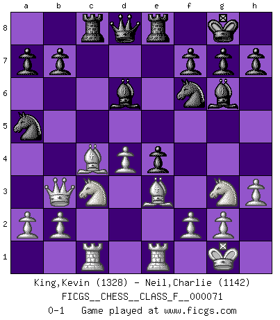 Last move : 0-1 2009 April 17 2:57:7 [Event "FICGS__CHESS__CLASS_F__000071"] [Site "FICGS"] [Date "2009.01.08"] [Round "1"] [White "King,Kevin"] [Black "Neil,Charlie"] [Result "0-1"] [WhiteElo "1328"] [BlackElo "1142"] 1.d4 Nf6 2.c4 e6 3.Nc3 Bb4 4.e3 O-O 5.Qc2 d5 6.Bd3 c5 7.Nge2 cxd4 8.exd4 dxc4 9.Bxc4 Nc6 10.Be3 Re8 11.O-O e5 12.Rad1 e4 13.h3 Bf5 14.Ng3 Bg6 15.Rc1 Rc8 16.Qb3 Bd6 17.Rfe1 Na5 0-1 This chess game has been lost on time (started : 2009.01.08 20:42:55) Nimzo-Indian : 4.e3 O-O Kingside Castling by player Black (move 4) Kingside Castling by player White (move 11) Player Black won this chess game. Follow this game move after move (download)Of all my Russian books, the defense contains and diffuses the greatest 'warmth' which may seem odd seeing how supremely abstract Chess is supposed to be. (Vladimir Nabokov) Jede Eröffnung ist gut genug um gespielt zu werden, wenn nur ihr Ruf schlecht genug ist. (Savielly Grigorievitsch Tartakower) ¿Cual es el objetivo de jugar una apertura de gambito?... Para adquirir una reputación de ser un jugador apuesto a costo de perder el juego. (Siegbert Tarrasch) Ce n'est pas pour s'amuser qu'il joue aux échecs : il célèbre un culte. (Vladimir Nabokov) If you ain't just a little scared when you enter a casino, you are either very rich or you haven't studied the games enough. (Pappy)