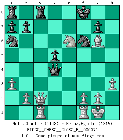 Last move : 1-0 2009 February 4 18:38:34 [Event "FICGS__CHESS__CLASS_F__000071"] [Site "FICGS"] [Date "2009.01.08"] [Round "1"] [White "Neil,Charlie"] [Black "Belaz,Egidio"] [Result "1-0"] [WhiteElo "1142"] [BlackElo "1216"] 1.d4 d5 2.c4 e6 3.Nf3 Bb4+ 4.Bd2 Bxd2+ 5.Nbxd2 c6 6.e3 Nf6 7.Bd3 O-O 8.O-O Na6 9.a3 c5 10.cxd5 exd5 11.Ne5 Re8 12.Rc1 cxd4 13.exd4 Be6 14.Ndf3 Bg4 15.h3 Be6 16.Ng5 Qb6 17.Qc2 Qxd4 18.Bxh7+ Kf8 19.Ng6+ fxg6 20.Bxg6 Rec8 21.Nxe6+ 1-0 Queen's gambit declined Kingside Castling by player Black (move 7) Kingside Castling by player White (move 8) Player White won this chess game. Follow this game move after move (download)A Chess game is a dialogue, a conversation between a player and his opponent. Each move by the opponent may contain threats or be a blunder, but a player cannot defend against threats or take advantage of blunders if he does not first ask himself: What is my opponent planning after each move ? (Bruce A. Moon) Aljechin war kein Nazi. Er war ein Opportunist. Ein schrecklicher Mann. Er liebte Geld über alles und würde für Geld ein Jude, ein Katolik oder ein Protestant werden. (Miguel Najdorf) Cuando veas una buena jugada, trata de encontrar otra mejor. (Emanuel Lasker) Votre prénom est 'Tactique', votre deuxième prénom est 'Tactique' et votre nom est 'Tactique'. (Ken Smith) I take risks, sometimes patients die, but not taking risks causes more patients to die. So I guess my biggest problem is I've been cursed with the ability to do the math. (Gregory House, House M.D.)