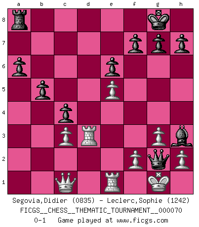 Last move : 0-1 2009 February 13 3:24:53 [Event "FICGS__CHESS__THEMATIC_TOURNAMENT__000070"] [Site "FICGS"] [Date "2009.01.08"] [Round "1"] [White "Segovia,Didier"] [Black "Leclerc,Sophie"] [Result "0-1"] [WhiteElo "0835"] [BlackElo "1242"] 1.d4 Nf6 2.c4 e6 3.g3 d5 4.Bg5 dxc4 5.e4 c5 6.d5 Be7 7.e5 Nxd5 8.Bxe7 Qxe7 9.Bxc4 Nc6 10.Nf3 O-O 11.O-O Rd8 12.Qe2 a6 13.Nc3 b5 14.Bb3 Bb7 15.Rad1 c4 16.Bc2 Ncb4 17.a3 Nxc3 18.bxc3 Nxc2 19.Qxc2 Bxf3 20.Rb1 Qxa3 21.Ra1 Qc5 22.Rae1 Rd3 23.Qc1 Qd5 24.Re3 Bg2 25.Rfe1 Bh3 26.Rxd3 Qg2+ 0-1 Catalan Opening Kingside Castling by player Black (move 10) Kingside Castling by player White (move 11) Player Black won this chess game. Follow this game move after move (download)Chess is mental torture. (Garry Kasparov) Wer mein Gambit spielt, muß bereit sein, alle Brücken hinter sich abzubrechen. Es verändert den ganzen Menschen. Es wirkt wie ein Zauberstab und fördert verkümmerte, gute Charakter- eigenschaften wieder zu Tage. (Emil Joseph Diemer) A la fecha, Fischer esta simplemente un nivel arriba de todos los mejores jugadores de Ajedrez del mundo. (John Jacobs) Les écrivains ont utilisé les échecs pour analyser les côtés extrêmes de la nature humaine. Dans ce cadre, les échecs offrent un champ d'expérimentation idéal. Mais on pourrait faire la même chose avec la peinture. Et là, en vous référant à Van Gogh, vous ne tirerez pas de conclusion définitive sur les peintres. (Gary Kasparov) As the days dwindle down... to a precious few. (Maxwell Anderson)