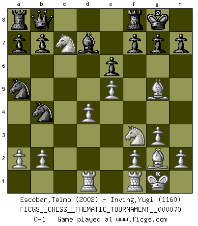 Last move : 0-1 2009 May 1 16:37:15 [Event "FICGS__CHESS__THEMATIC_TOURNAMENT__000070"] [Site "FICGS"] [Date "2009.01.08"] [Round "1"] [White "Escobar,Telmo"] [Black "Inving,Yugi"] [Result "0-1"] [WhiteElo "2002"] [BlackElo "1160"] 1.d4 Nf6 2.c4 e6 3.g3 Nc6 4.Nf3 d5 5.Bg2 dxc4 6.O-O Bb4 7.Nc3 Nd5 8.Qc2 O-O 9.e4 Nb6 10.Be3 Bd7 11.Rad1 Bd6 12.Qe2 Qe7 13.e5 Bb4 14.Nb5 Nd5 15.Bg5 Qe8 16.Qxc4 Na5 17.Qxb4 Nxb4 18.Nxc7 Qb8 0-1 This chess game has been lost on time (started : 2009.01.08 21:27:2) Catalan Opening Kingside Castling by player White (move 6) Kingside Castling by player Black (move 8) Player Black won this chess game. Follow this game move after move (download)Chess is above all, a fight ! (Emanuel Lasker) Glücklicherweise sind Großmeister Ruben Fines reine Schachbücher weniger phallozentrisch [als seine Schachpsychologie] und deswegen auch weniger lächerlich. (Nigel Short) Una mala movida nulifica cuarenta buenas. (Horowitz) Les Echecs représentent une sphère d'idées créatrices basée sur la volonté des deux protagonistes. (Smyslov) Any activity becomes creative when the doer cares about doing it right or doing it better. (John Updike)