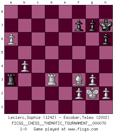 Last move : 1-0 2009 July 22 16:0:7 [Event "FICGS__CHESS__THEMATIC_TOURNAMENT__000070"] [Site "FICGS"] [Date "2009.01.08"] [Round "1"] [White "Leclerc,Sophie"] [Black "Escobar,Telmo"] [Result "1-0"] [WhiteElo "1242"] [BlackElo "2002"] 1.d4 Nf6 2.c4 e6 3.g3 d5 4.Nc3 c5 5.Nf3 Nc6 6.cxd5 exd5 7.Bg2 Be7 8.dxc5 Bxc5 9.O-O O-O 10.Bg5 d4 11.Bxf6 Qxf6 12.Ne4 Qe7 13.Nxc5 Qxc5 14.Qd2 Bf5 15.Rac1 Qb6 16.Rfd1 Rfd8 17.Qf4 Bg6 18.Rd2 d3 19.exd3 Rxd3 20.Rxd3 Bxd3 21.Ne5 Nxe5 22.Qxe5 Rf8 23.Bd5 Bg6 24.Rc7 a5 25.Rxb7 Qd8 26.Ra7 Qb6 27.Rxa5 Kh8 28.Qc3 h6 29.Qc5 Rb8 30.Qxb6 Rxb6 31.b3 Kh7 32.a4 Rb4 33.Rb5 Rd4 34.Bf3 Rd3 35.Kg2 Rc3 36.a5 Rc1 37.Rd5 Rb1 38.a6 Ra1 39.Rd6 Ra3 40.b4 Bd3 41.Rxd3 1-0 Catalan Opening Kingside Castling by player White (move 9) Kingside Castling by player Black (move 9) Player White won this chess game. Follow this game move after move (download)There is only one thing Fischer does in Chess without pleasure: to lose ! (Boris Spassky) Im Internet Chess Club betrug mein Rating vorübergehend 3350 ELO-Punkte. (Sergej Karjakin) El Peón aislado arroja penumbra sobre todo el tablero. (Aaron Nimzovich) Ne tendez aucun piège pour le plaisir ! Ne jouez rien dans l'espoir que l'adversaire réagisse de façon stupide ! Prenez toujours pour acquis que l'adversaire va trouver le meilleur coup ! Ne jouez jamais de coup dans l'espoir que l'adversaire ne voie pas la menace ! Chacun de vos coups doit améliorer la position d'une façon ou d'une autre. If you work for a living, why do you kill yourself working ? (Tuco to a chicken in The Good, The Bad and The Ugly)