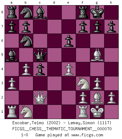 Last move : 1-0 2009 June 2 19:7:5 [Event "FICGS__CHESS__THEMATIC_TOURNAMENT__000070"] [Site "FICGS"] [Date "2009.01.08"] [Round "1"] [White "Escobar,Telmo"] [Black "Lemay,Simon"] [Result "1-0"] [WhiteElo "2002"] [BlackElo "1117"] 1.d4 Nf6 2.c4 e6 3.g3 d5 4.Bg2 Bb4+ 5.Bd2 Qe7 6.Nf3 O-O 7.O-O dxc4 8.Qc2 c5 9.dxc5 Qxc5 10.Bg5 Nd5 11.e4 Nb6 12.a3 Ba5 13.b4 1-0 This chess game has been lost on time (started : 2009.01.08 21:27:2) Catalan : Closed Kingside Castling by player Black (move 6) Kingside Castling by player White (move 7) Player White won this chess game. Follow this game move after move (download)Checkers is for tramps. (Paul Morphy) Weshalb minderdergeübte Spieler mit g2-g4 beginnen? Die betreffenden sind unschlüssig, ob sie nun rechts (h4) oder links (f4) beginnen sollen, und in ihrer Ratlosigkeit entschliessen sie sich nach guter Bürgerart dazu, den goldenen Mittelweg zu wählen. (Aaron Nimzowitsch) Yo he agregado estos principios a la ley: pongan los Caballos en acción antes de que los dos Alfiles sean desarrollados. (Emanuel Lasker) Psychologiquement, tu dois avoir confiance en toi même, mais cette confiance doit être basée sur des faits. (Robert Fischer) Thus, what is of supreme importance in war is to attack the enemy's strategy. (Sun Tzu)