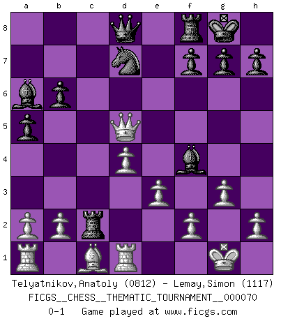 Last move : 0-1 2009 March 20 23:26:23 [Event "FICGS__CHESS__THEMATIC_TOURNAMENT__000070"] [Site "FICGS"] [Date "2009.01.08"] [Round "1"] [White "Telyatnikov,Anatoly"] [Black "Lemay,Simon"] [Result "0-1"] [WhiteElo "0812"] [BlackElo "1117"] 1.d4 Nf6 2.c4 e6 3.g3 d5 4.cxd5 Nxd5 5.Bg2 c6 6.e3 Nd7 7.Ne2 Be7 8.O-O O-O 9.Qb3 b6 10.Nbc3 a5 11.Nxd5 exd5 12.Bxd5 cxd5 13.Qxd5 Ba6 14.Qf3 Rc8 15.Rd1 Rc2 16.Nf4 Bd6 17.Qd5 Bxf4 0-1 Catalan Opening Kingside Castling by player White (move 8) Kingside Castling by player Black (move 8) Player Black won this chess game. Follow this game move after move (download)All that matters on the Chessboard is good moves. (Bobby Fischer) Schach ist das schnellste Spiel der Welt, weil man in jeder Sekunde Tausende von Gedanken ordnen muß. (Albert Einstein) Muchos se han convertido en Maestros de Ajedrez, nadie se ha convertido en el Maestro del Ajedrez. (Siegbert Tarrasch) C'est une question de caractère, Beaucoup de gens perdent leur motivation très vite. D'autres, ils sont rares, peuvent la conserver très longtemps. J'aime les échecs, encore aujourd'hui je suis heureux d'analyser des parties. J'aime toujours gagner, je déteste encore perdre. Bien jouer est important pour mon intégrité intellectuelle et morale. Et puis les échecs vivent en ce moment une période historique grâce à Internet. Ils se développent dans les systèmes éducatifs à travers le monde. Ils sortent de leur ghetto, et c'est mon rôle de mener à bien cette révolution. (Gary Kasparov) Employ the attack like tactic of defense. (Chinese proverb)