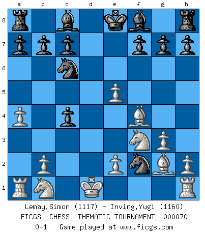 Last move : 0-1 2009 January 14 20:55:20 [Event "FICGS__CHESS__THEMATIC_TOURNAMENT__000070"] [Site "FICGS"] [Date "2009.01.08"] [Round "1"] [White "Lemay,Simon"] [Black "Inving,Yugi"] [Result "0-1"] [WhiteElo "1117"] [BlackElo "1160"] 1.d4 Nf6 2.c4 e6 3.g3 Nc6 4.Nf3 d5 5.Bg2 dxc4 6.a4 e5 7.dxe5 Qxd1+ 8.Kxd1 Ng4 9.Bf4 Nxf2+ 0-1 Catalan Opening Player Black won this chess game. Follow this game move after move (download)The game of chess is the touchstone of the intellect. (Goethe) Man kann eine Schachpartie nur gewinnen, wenn das Gleichgewicht gestört ist. In einer Stellung mit ungestörtem Gleichgewicht ist auch das größte Genie hilflos - in der Stellung steckt dann eben kein genialer Einfall. (Wilhelm Steinitz) Yo siempre he tenido un ligero sentimiento de lástima por una persona que no tiene conocimiento del Ajedrez. (Siegbert Tarrasch) J'apprécie les joueurs d'est-indienne, c'est grâce à eux que je nourris ma famille depuis tant d'années. (Petrosian) A belief is an idea the mind possesses, an idea that possesses the mind. (Robert Oxden Bolton)