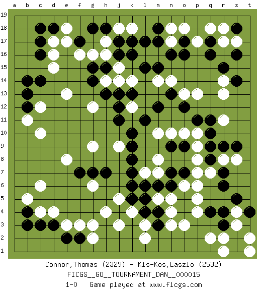 Last move : 1-0 2009 July 2 3:38:48 [Event "FICGS__GO__TOURNAMENT_DAN__000015"] [Site "FICGS"] [Date "2009.01.10"] [Round "1"] [Black "Connor,Thomas"] [White "Kis-Kos,Laszlo"] [Result "1-0"] [Rating 1 "2329"] [Rating 2 "2532"] 1.q16 d4 2.q4 d16 3.f17 h17 4.c17 d17 5.c16 d15 6.d18 e18 7.c18 e17 8.c14 o3 9.r6 k4 10.o17 c12 11.b14 e13 12.c3 c4 13.d3 e3 14.e2 f3 15.f2 g3 16.b4 b5 17.b3 c6 18.o5 r11 19.r15 r8 20.k6 m5 21.k8 m7 22.k10 q2 23.r3 j9 24.k9 r2 25.s2 s4 26.s5 s3 27.r4 t2 28.s1 r1 29.t4 t1 30.q8 q7 31.r7 p8 32.q9 p6 33.r9 s8 34.s9 p9 35.h7 k12 36.j11 g9 37.j12 k14 38.j13 j14 39.k13 m14 40.l17 g12 41.f7 g6 42.g7 e8 43.m12 m10 44.l11 o13 45.j4 j5 46.k5 h4 47.l4 j3 48.l5 l3 49.m4 p5 50.m6 l7 51.k7 n5 52.n6 n4 53.o4 n3 54.o12 p13 55.o7 o6 56.n7 m8 57.p11 p7 58.q10 r14 59.s14 r13 60.b12 b11 61.b13 c10 62.l6 p4 63.o9 o10 64.n9 p10 65.q11 n10 66.n13 n14 67.h13 g2 68.m3 l2 69.g14 r17 70.s16 n17 71.n16 o18 72.m17 p17 73.o16 n18 74.q17 q18 75.s18 r18 76.m18 m16 77.k16 l16 78.j17 k18 79.k17 h16 80.h18 j18 81.g18 f16 82.h15 j15 83.j16 g16 84.l15 s17 85.m15 h14 86.g15 1-0 Here are the names of the openings (joseki) played in the four corners : Corner d16 : d16 f17 Hoshi (Hwajeom, Seongjeom, Xingwei`) 4-4 Point. The star or hoshi (4-4) point, emphasizing influence at the potential expense of territory. Ikken Kakari (Hankan Keolch'im, Yi Gua`jiao~, 1-Space Low Approach). Black 2 is the standard approach move to the 4-4. Corner q4 : q4 o3 Hoshi (Hwajeom, Seongjeom, Xingwei`) 4-4 Point. The star or hoshi (4-4) point, emphasizing influence at the potential expense of territory. Ikken Kakari (Hankan Keolch'im, Yi Gua`jiao~, 1-Space Low Approach). White 2 is the standard approach move to the 4-4. Corner d4 : d4 c3 Hoshi (Hwajeom, Seongjeom, Xingwei`) 4-4 Point. The star or hoshi (4-4) point, emphasizing influence at the potential expense of territory. Player Black won this Go (weiqi, baduk) game. Follow this game move after move (download)Keep away from thickness. (Anonymous) Philosophers use a language that is already deformed as though by shoes that are too tight. (Ludwig Wittgenstein)