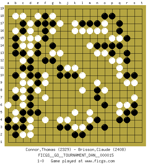 Last move : 1-0 2009 March 27 22:16:56 [Event "FICGS__GO__TOURNAMENT_DAN__000015"] [Site "FICGS"] [Date "2009.01.10"] [Round "1"] [Black "Connor,Thomas"] [White "Brisson,Claude"] [Result "1-0"] [Rating 1 "2329"] [Rating 2 "2408"] 1.q16 d17 2.q4 d3 3.d15 d13 4.f15 f17 5.c17 c18 6.c16 b18 7.c13 c12 8.d12 c14 9.b13 d14 10.b14 c15 11.b15 e15 12.e14 d16 13.e13 d15 14.d11 r6 15.o3 r9 16.c5 f4 17.d8 k3 18.r5 q6 19.r13 o17 20.q17 k16 21.m17 m16 22.l17 l16 23.n17 n16 24.o18 o16 25.p18 k17 26.m3 k5 27.g14 c10 28.c11 c7 29.d7 c6 30.d6 b5 31.c4 b4 32.c3 c8 33.h3 h4 34.j3 j4 35.k2 l3 36.l2 m4 37.n4 m5 38.b3 d9 39.e9 e8 40.d10 c9 41.e5 f7 42.a4 a6 43.b7 b8 44.b10 d4 45.d5 f9 46.e10 c2 47.b2 d2 48.a3 f10 49.f12 q12 50.r12 q11 51.o6 g13 52.g12 h13 53.n7 l8 54.h11 j11 55.h10 q5 56.r4 o8 57.j10 k11 58.p14 o13 59.o14 n13 60.n8 n9 61.g17 g16 62.f16 g18 63.e17 e18 64.f18 b16 65.k10 l10 66.n14 m14 67.p13 p12 68.s10 q15 69.q14 p15 70.r15 h17 71.f17 s9 72.r10 q10 73.s6 s7 74.s5 1-0 Here are the names of the openings (joseki) played in the four corners : Corner d16 : d17 d15 Komoku (Somok, Xiao~mu`) 3-4 Point. The komoku (3-4) point is the traditional corner enclosure move.. Ikken Takagakari (Hankan Nop'dakeolch'im, Yi Gaogua`jiao~, 1-Space High Approach). The 5-4 approach move has become more popular in modern times, as modern Go emphasizes speed and influence. Corner q4 : q4 r6 Hoshi (Hwajeom, Seongjeom, Xingwei`) 4-4 Point. The star or hoshi (4-4) point, emphasizing influence at the potential expense of territory. Ikken Kakari (Hankan Keolch'im, Yi Gua`jiao~, 1-Space Low Approach). White 2 is the standard approach move to the 4-4. Corner d4 : d3 c5 Komoku (Somok, Xiao~mu`) 3-4 Point. The komoku (3-4) point is the traditional corner enclosure move.. Ikken Kakari (Hankan Keolch'im, Yi Gua`jiao~, 1-Space Low Pincer). The small knight move is the basic approach move to the 3-4 point stone. It has been continually used for over four centuries. There are limitless variations, with new moves constantly being discovered. Black 2 opens the door to a treaure store of joseki. Player Black won this Go (weiqi, baduk) game. Follow this game move after move (download)Conservative and slow will win. Believe it ! (Anonymous) Coffee just isn't my cup of tea. (Unknown)